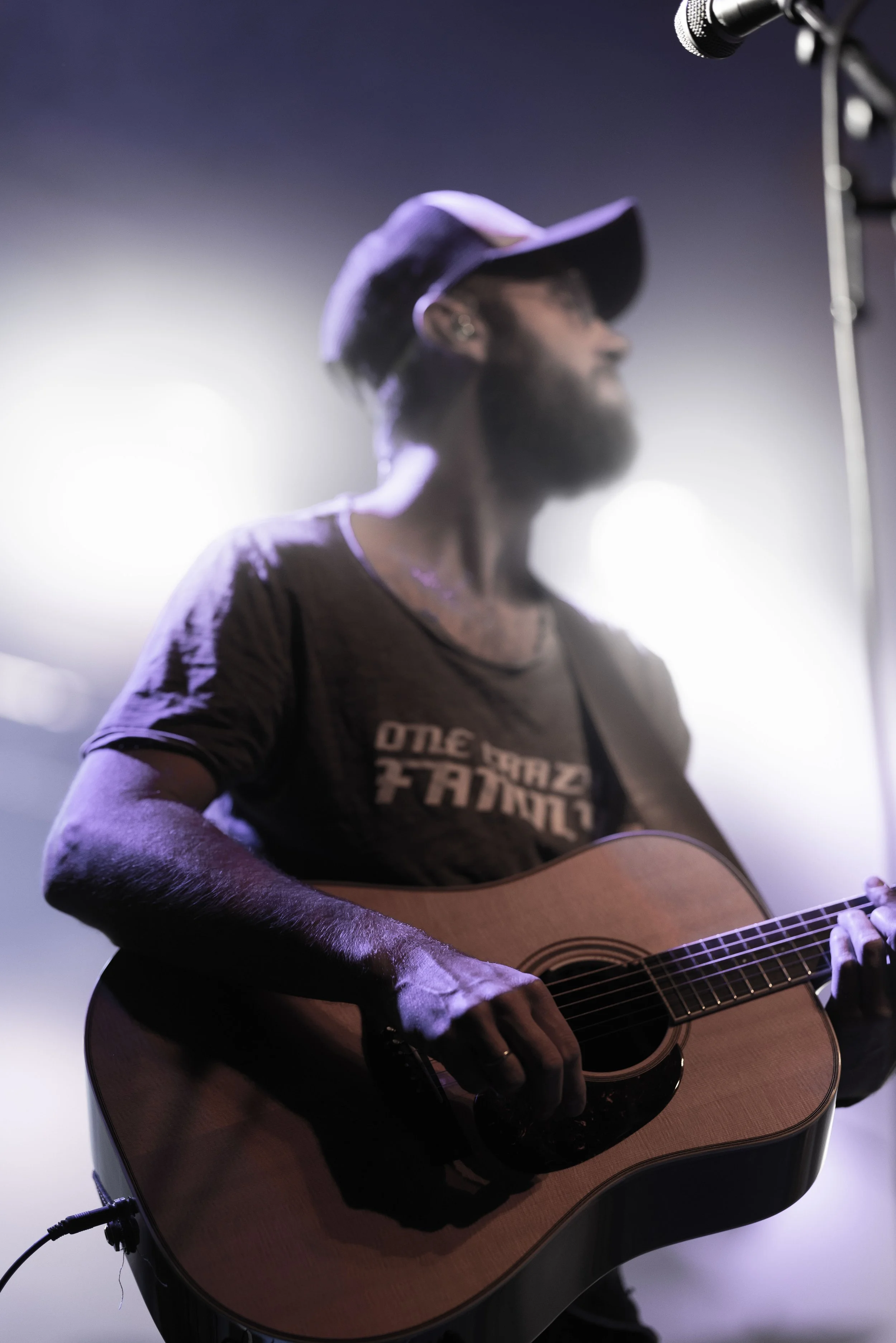 Musiker spielt Gitarre auf einer Bühne bei schwachem Bühnenlicht, trägt ein T-Shirt und eine Cap.