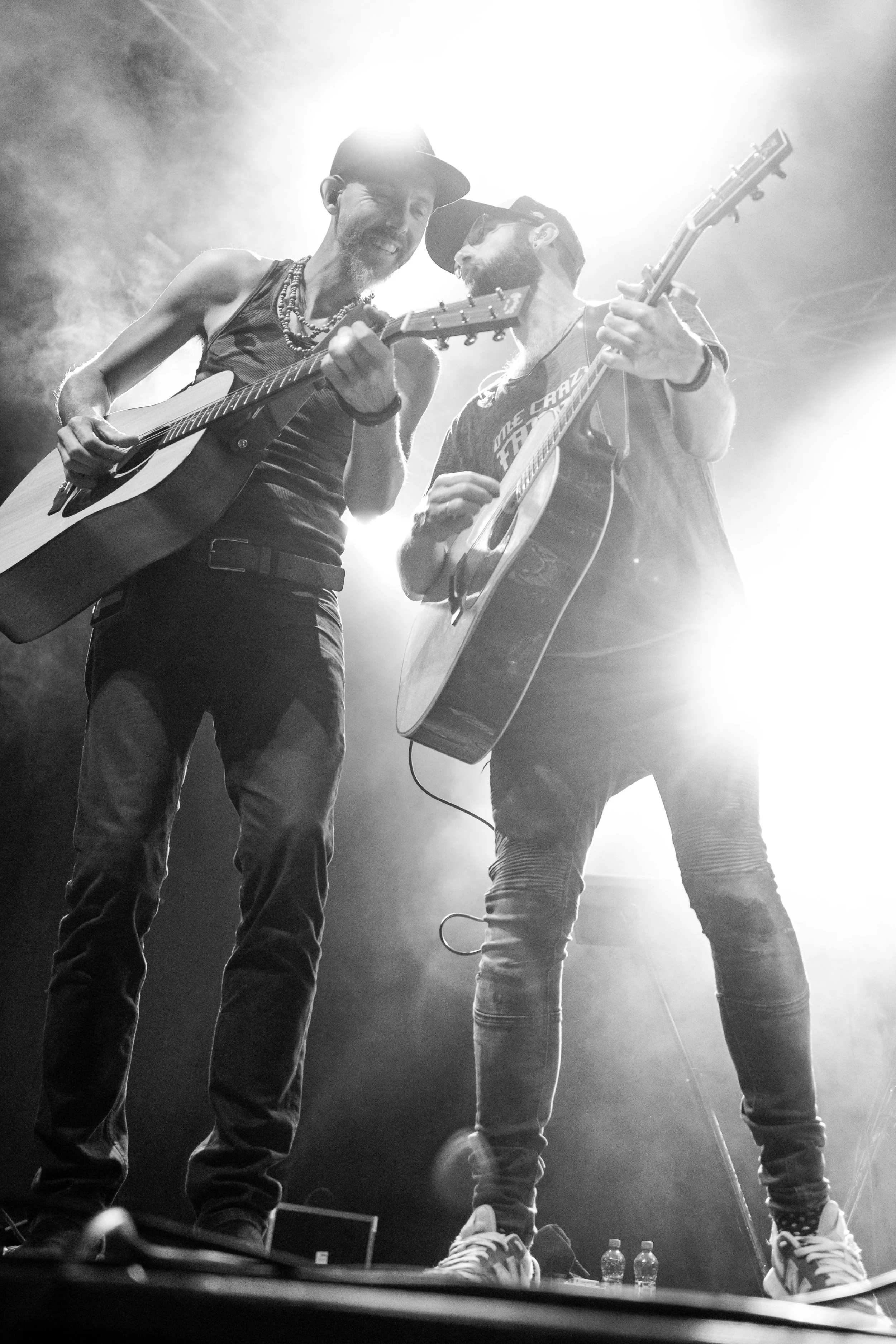 Zwei Männer spielen Gitarre auf einer Bühne bei einem Konzert, beide lächeln und sind in monochromer Beleuchtung. Einer trägt eine Badekappe, der andere trägt eine Kappe und eine Weste.