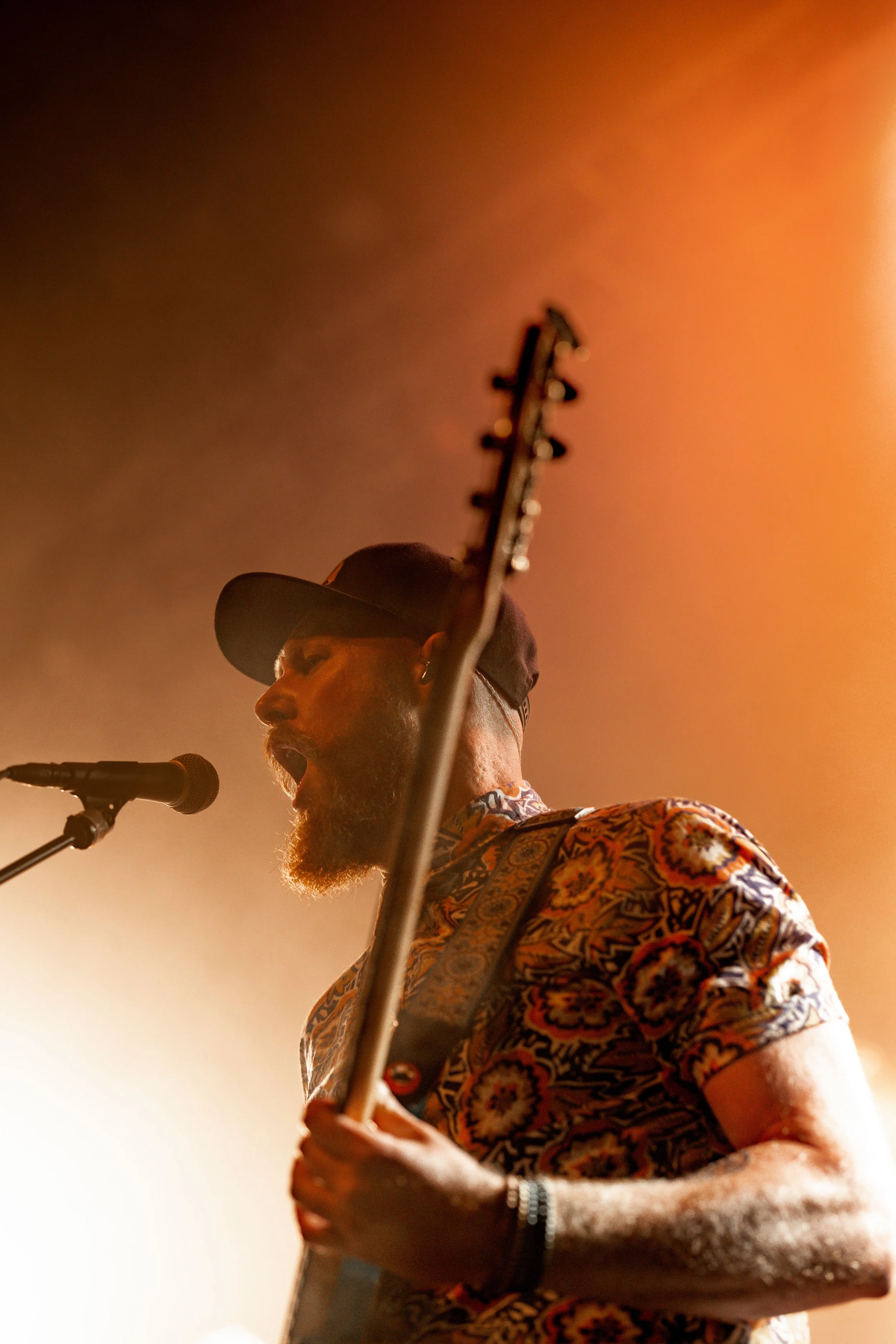 Musiker mit Beanie, Brille und Paisleymuster-Shirt, singt in Mikrofon, spielt Gitarre, auf Bühne bei warmem Licht.