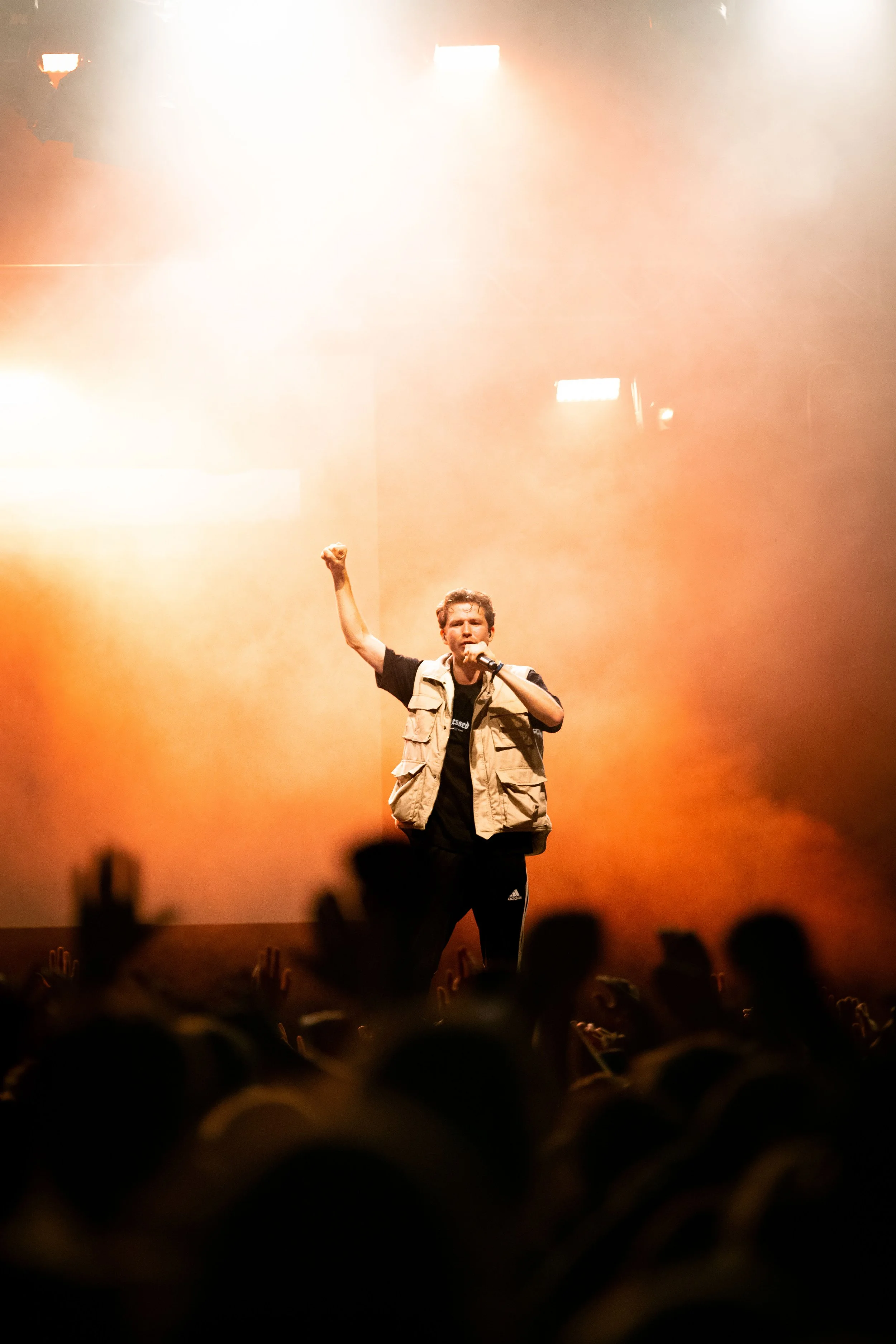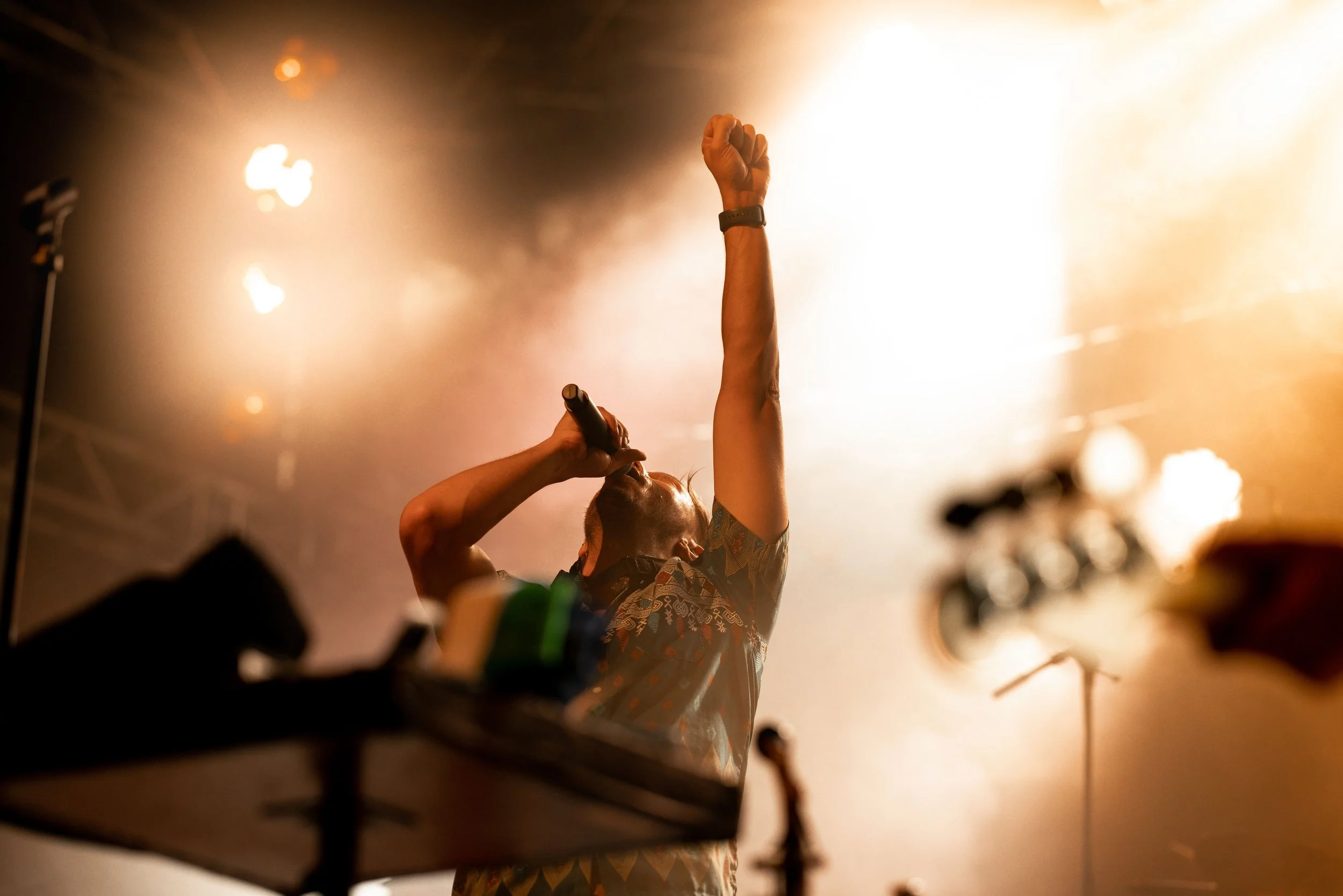 Ein Musiker singt bei einem Konzert mit erhobener Faust, im Hintergrund helles Licht und Rauch, während er ein Mikrofon hält.
