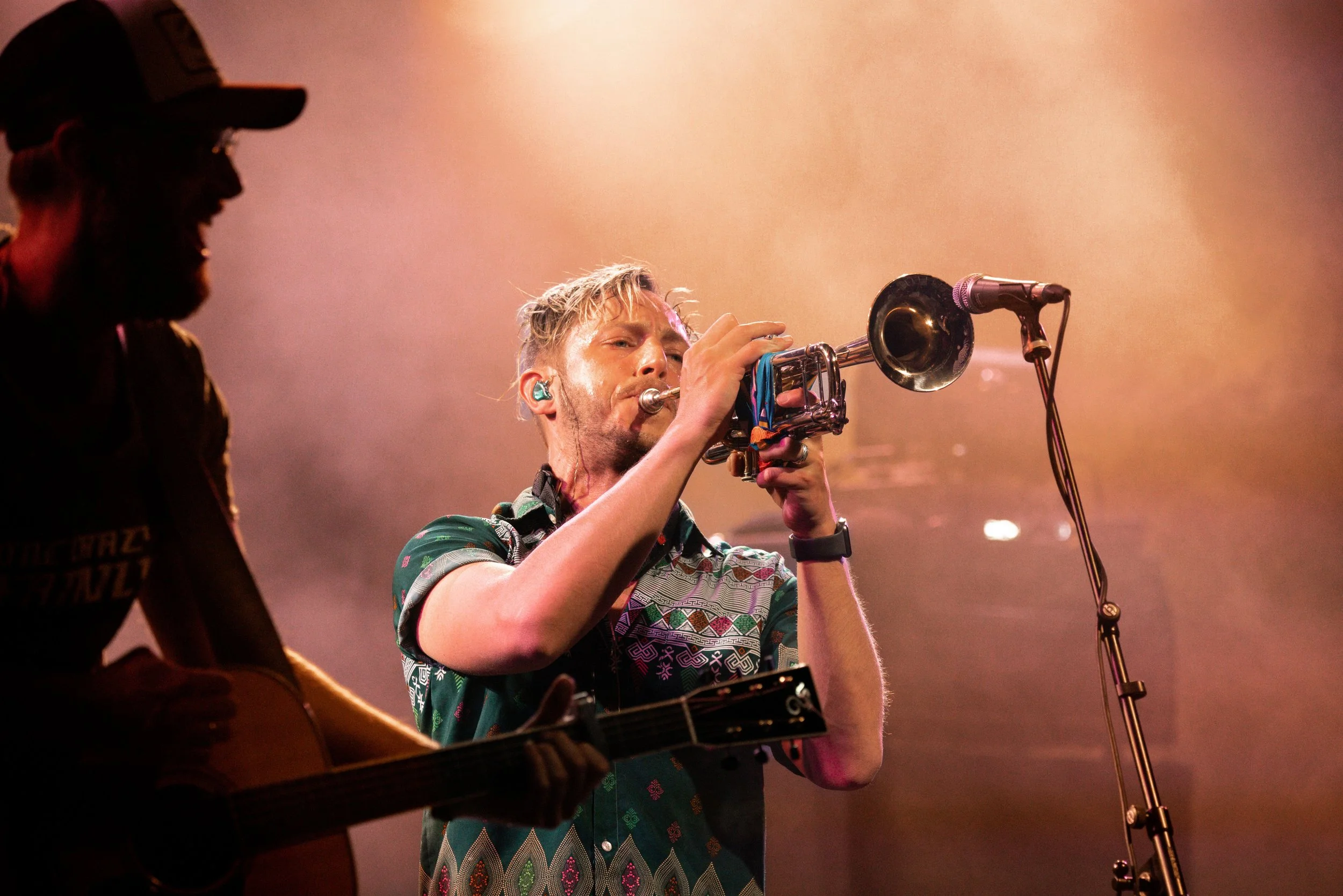 Musiker spielt auf einer Bühne Trompete, während ein anderer Musiker Gitarre spielt.
