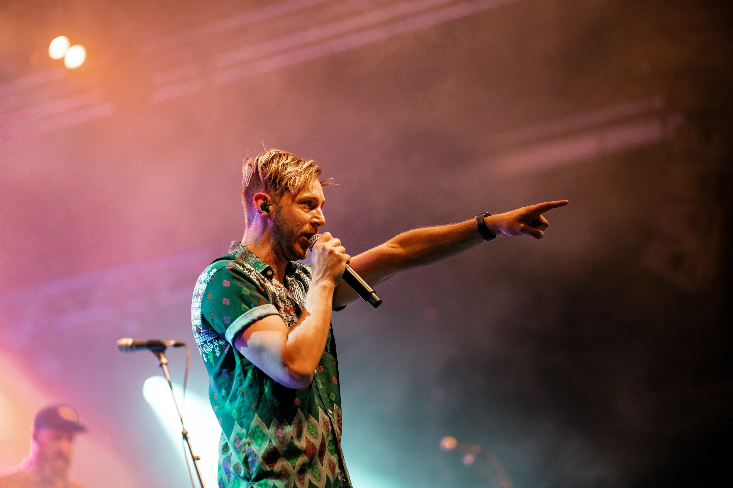 Ein männlicher Sänger mit kurzen blonden Haaren und einem grünen Hemd mit bunten Mustern, der auf einer Bühne singt und in die Richtung des Publikums zeigt, während er ein Mikrofon hält. Im Hintergrund ist ein unscharfer Musiker zu sehen, und die Büh