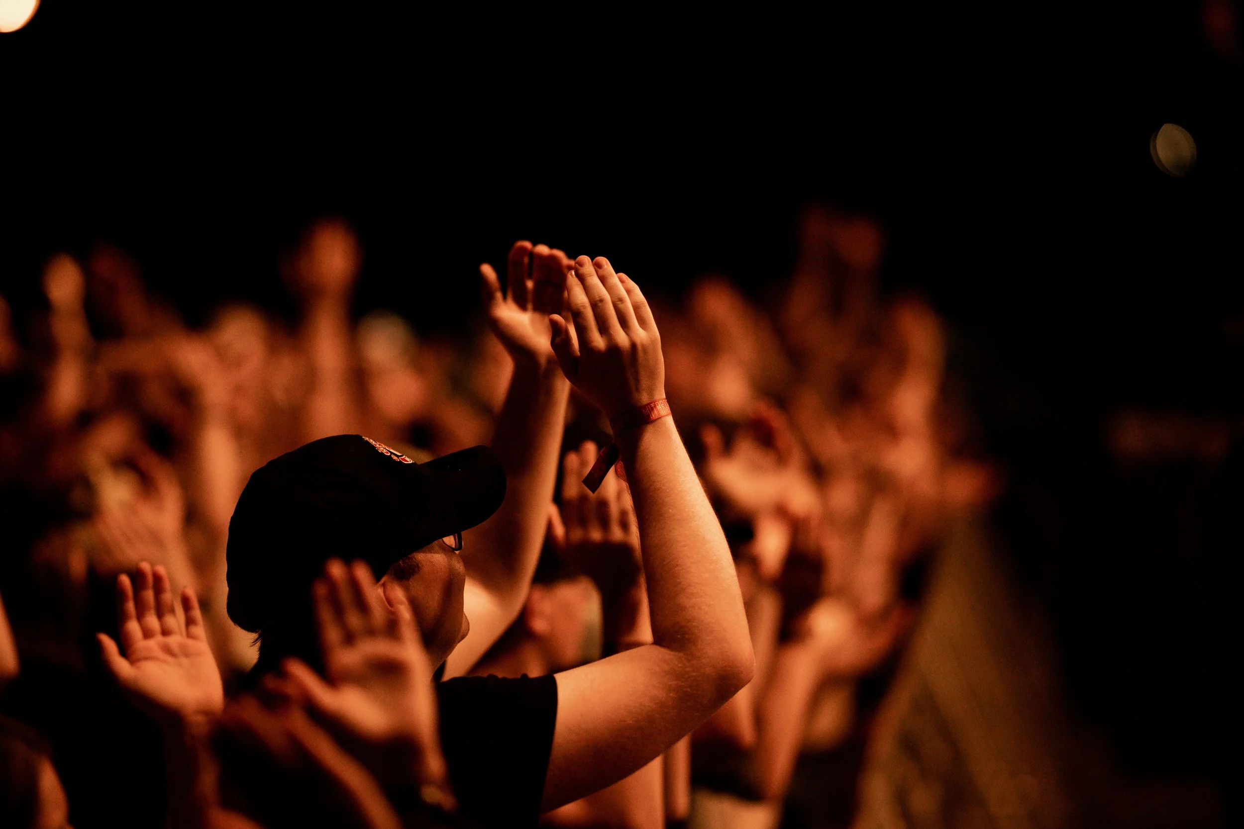 Menschen bei einem Konzert oder einer Veranstaltung, die applaudieren oder die Hand heben, bei Dunkelheit mit warmem Licht