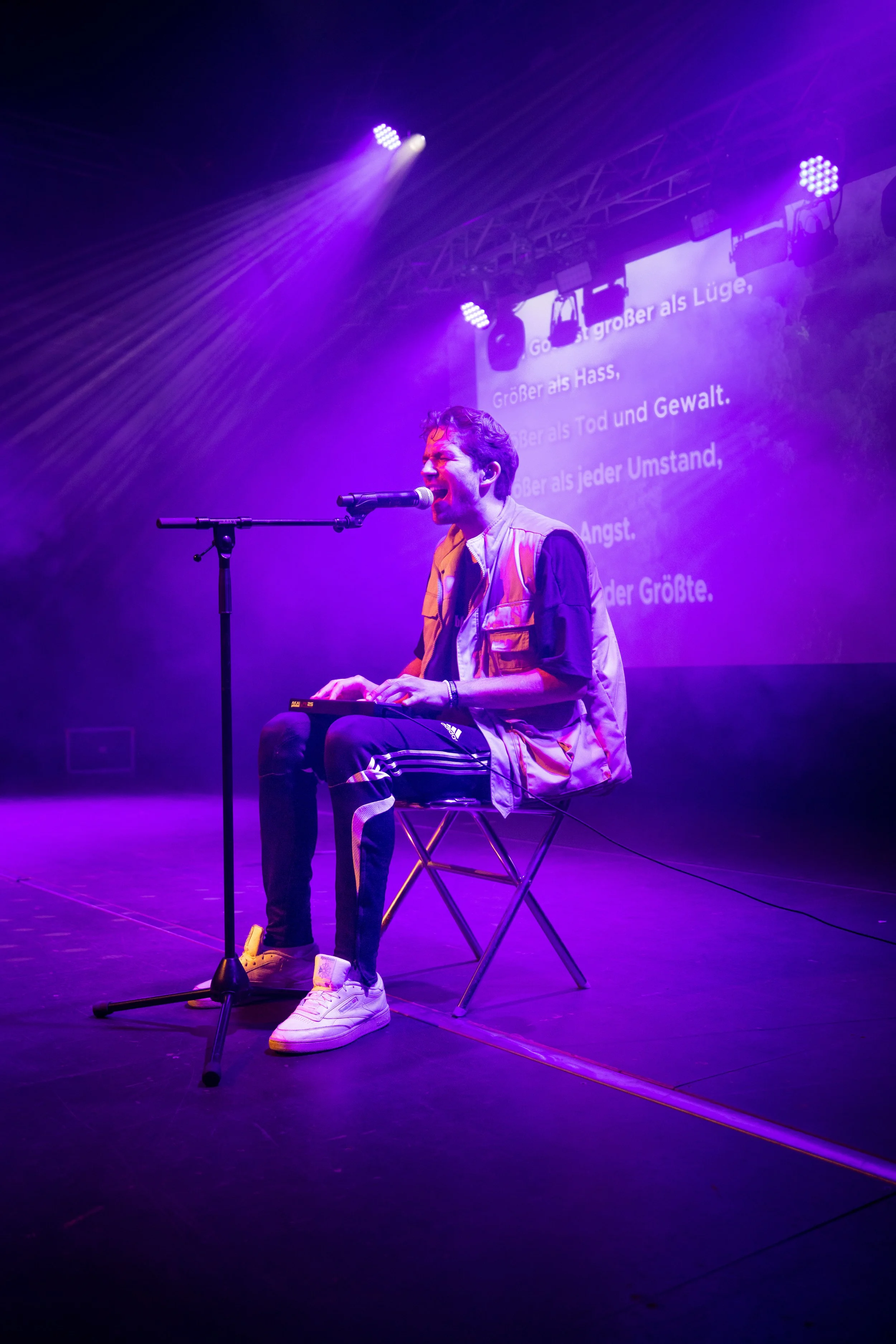 Ein junger Mann sitzt auf einem Stuhl und singt in ein Mikrofon, während bunte Bühnenlichter ihn beleuchten und Texte auf einer Leinwand im Hintergrund sichtbar sind.