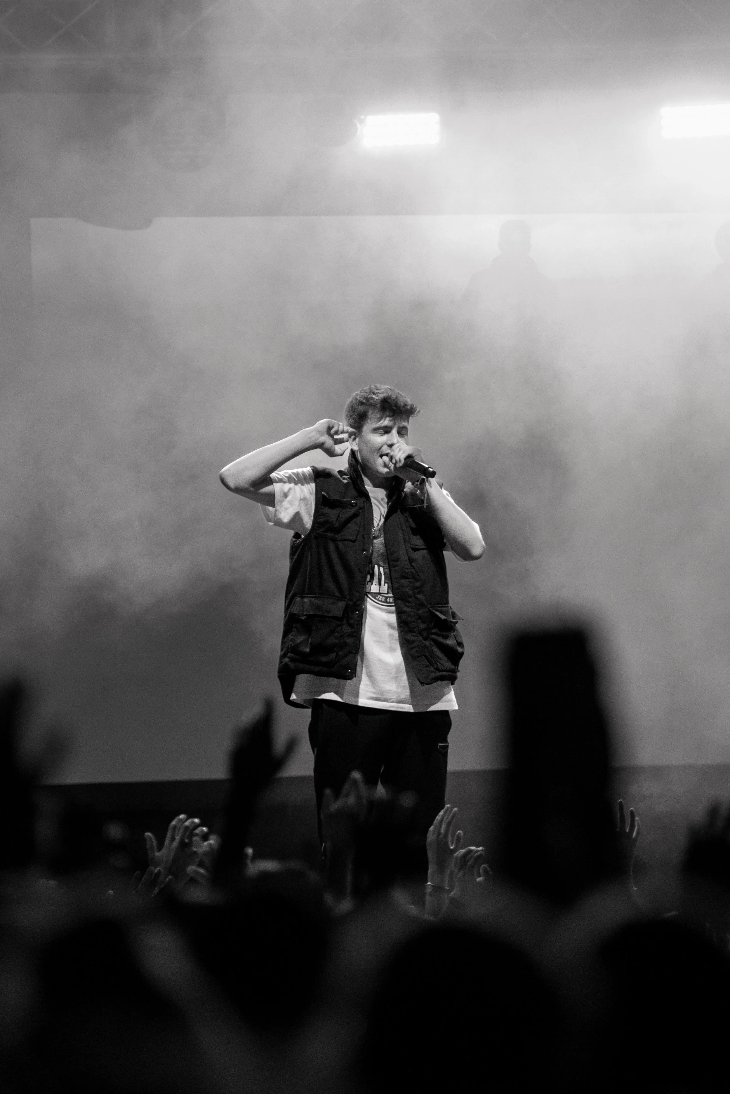 Ein männlicher Sänger während eines Konzerts, singt in ein Mikrofon, umgeben von einem Publikum mit erhobenen Händen, im Schwarz-Weiß-Foto.