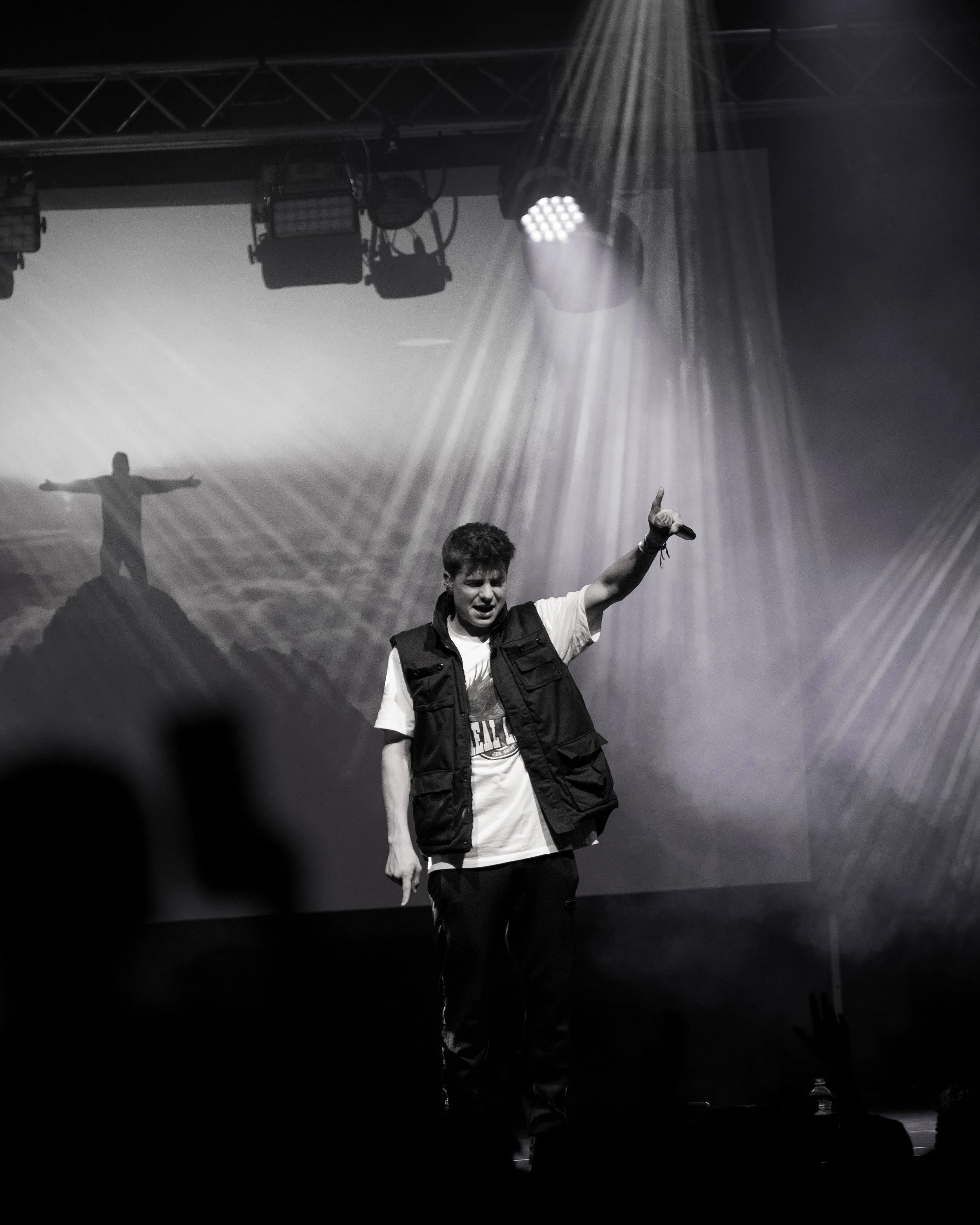 Ein junger Mann auf einer Bühne, der ins Publikum zeigt, mit einer zweiten Person im Hintergrund auf einer Felsenlandschaft, alles in Schwarz-Weiß.