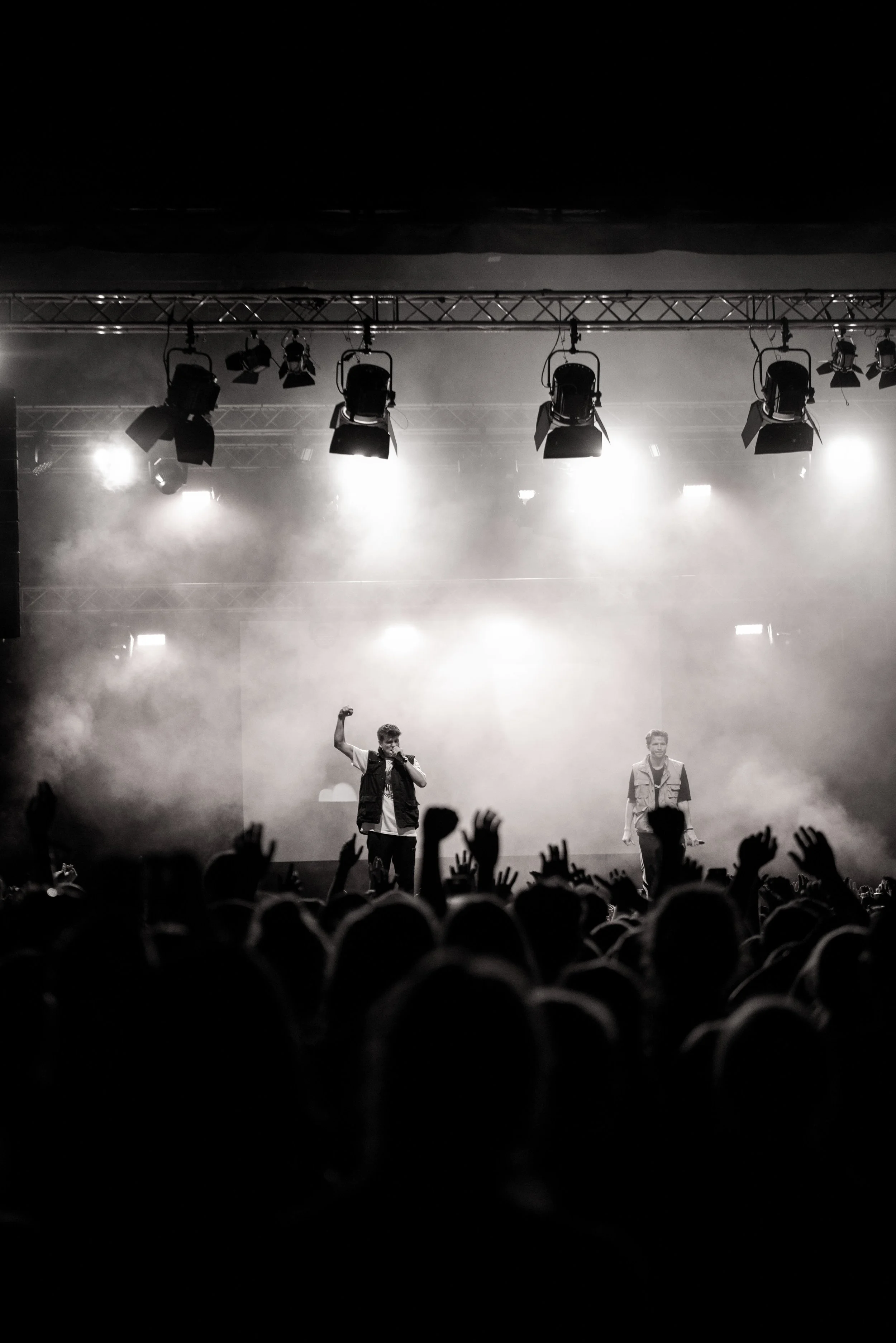 Zwei Sänger auf einer Bühne bei einem Konzert, in schwarz-weiß, mit Publikum im Vordergrund, Bühnenlicht und Rauch.