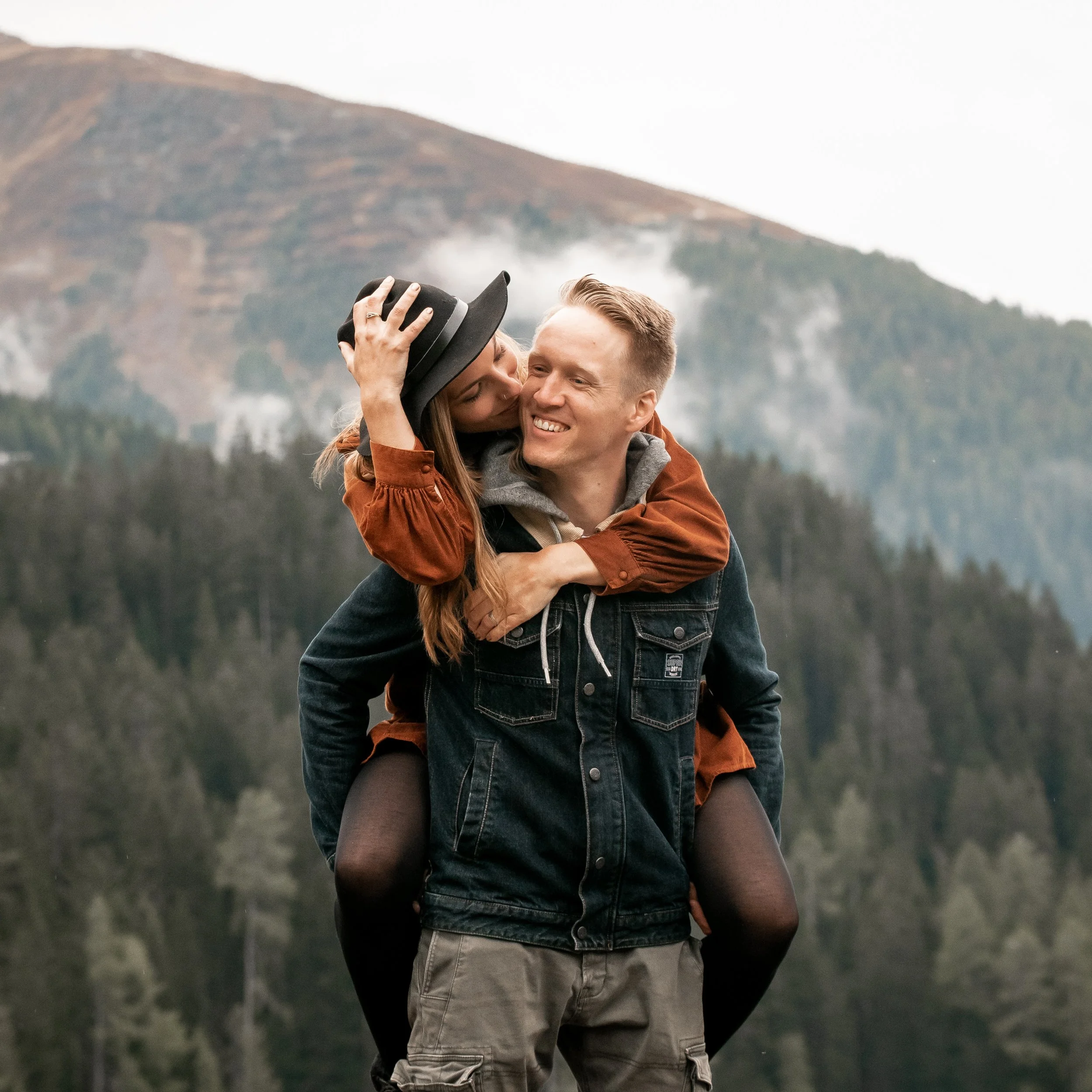 Paare im Freien vor Bergen mit Wald, lachend, umarmend, das Mädchen trägt einen schwarzen Hut.