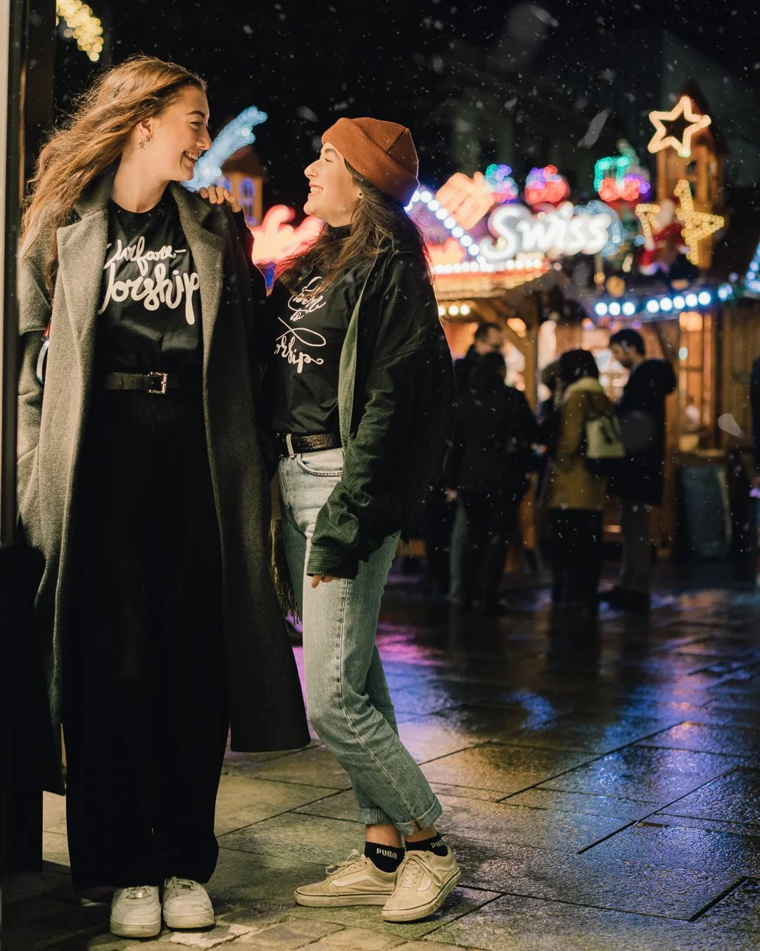 Zwei junge Frauen stehen vor einem geschmückten Weihnachtsbaum, lächeln und tragen schwarze T-Shirts mit weißen Schriftzügen.