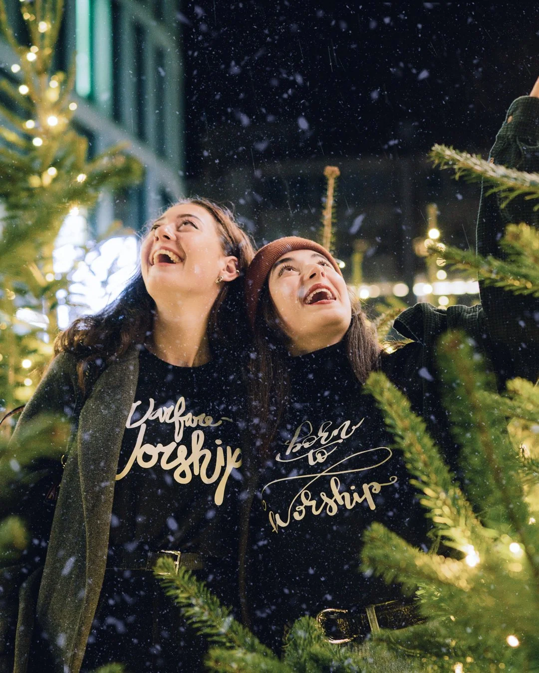 Zwei lachende Frauen beim Weihnachtsbaum-Shopping im festlich beleuchteten Laden während Schneefall, beide tragen schwarze T-Shirts mit goldener Schrift 'Dare to Worship', umgeben von Weihnachtsbäumen.