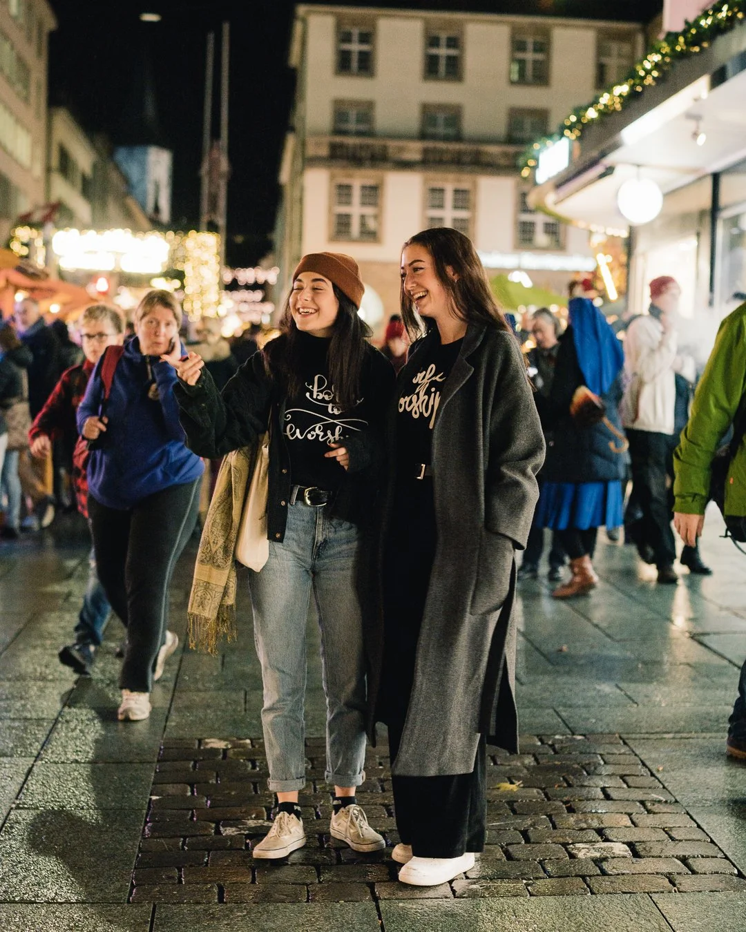 Zwei lachende Frauen, die nachts auf einer festlich beleuchteten Fußgängerzone spazieren, umgeben von anderen Menschen, einige mit Weihnachtsmützen und -dekorationen.