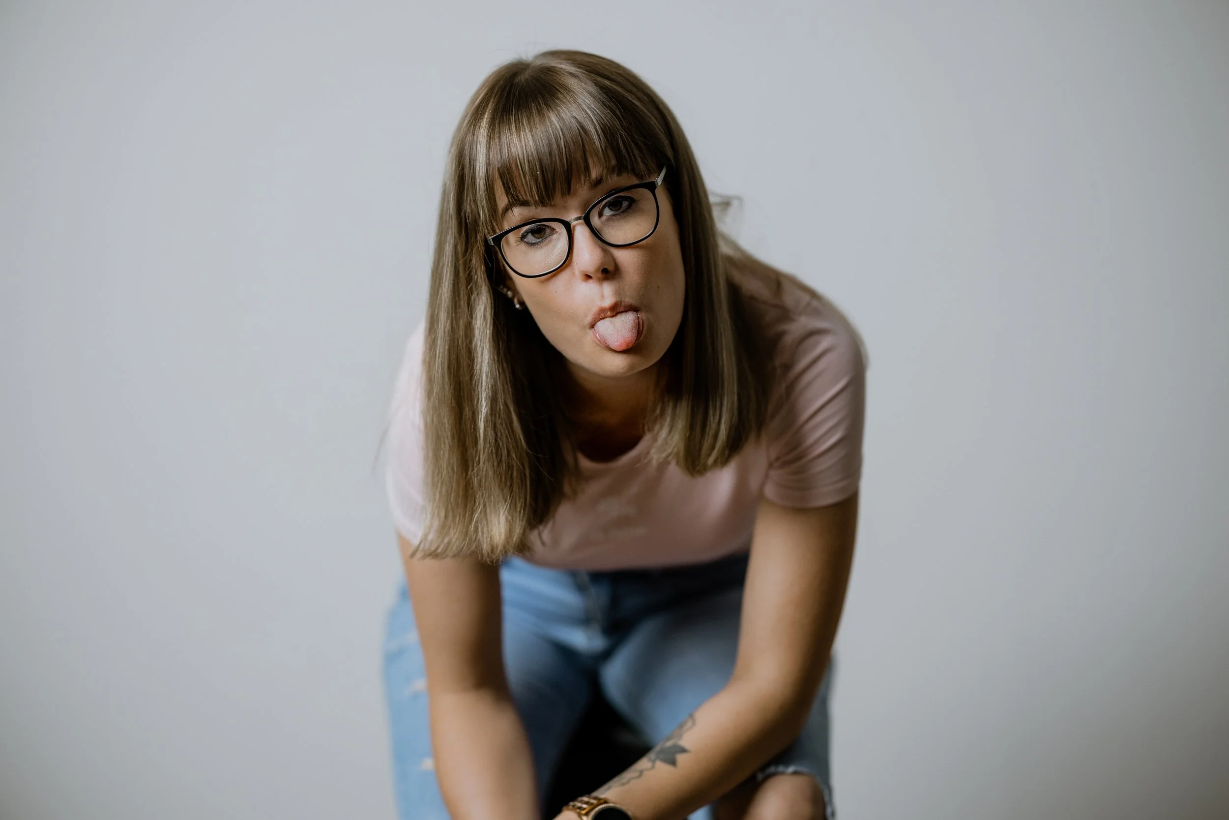 Junge Frau mit Brille und Tattoo auf dem Arm sitzt und macht einen Schneidezungen-Grimasse.