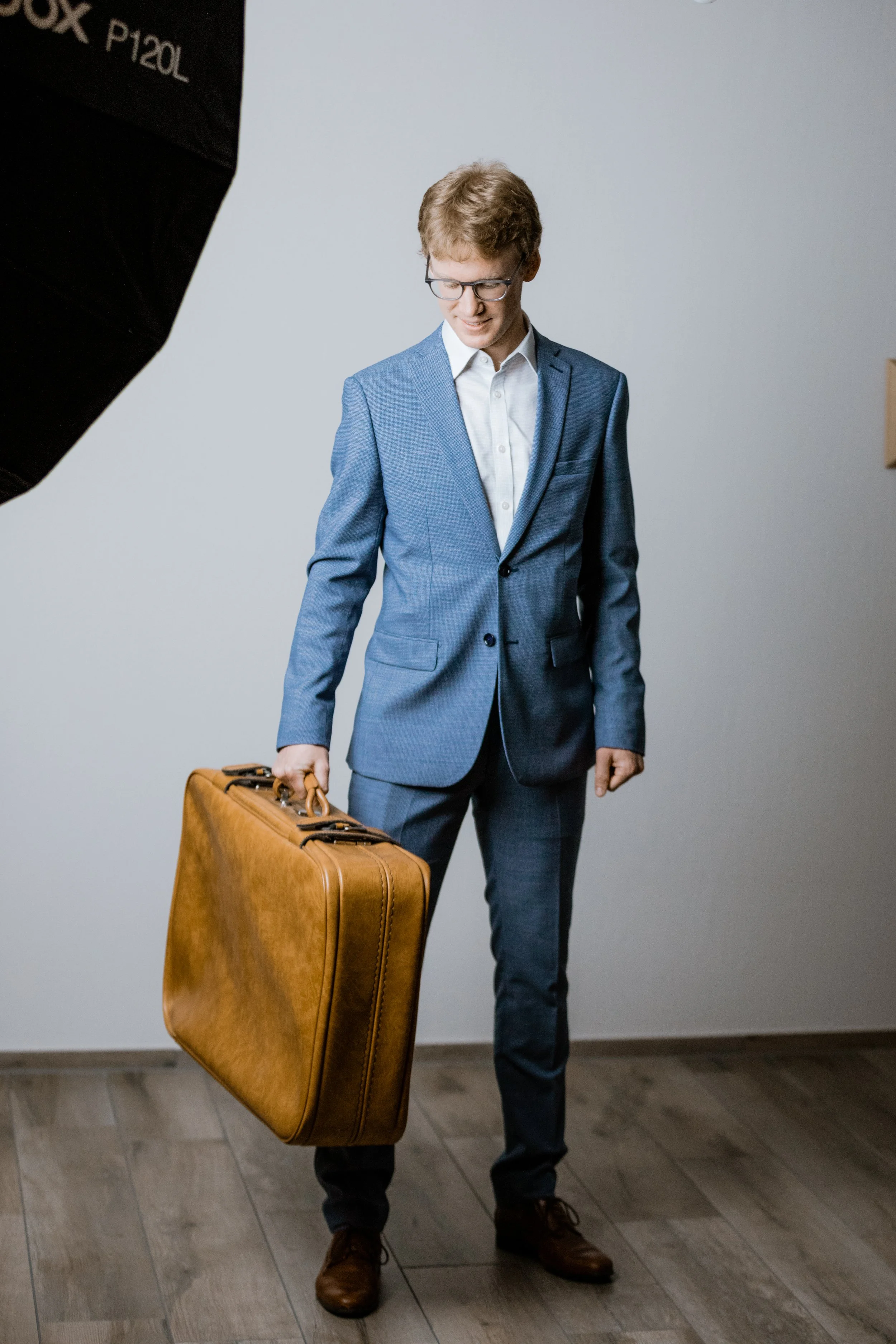 Ein junger Mann in einem blauen Anzug hält eine braune Koffer in der Hand und steht in einem Raum mit weißem Wand und Holzboden, während er lächelnd nach unten schaut.