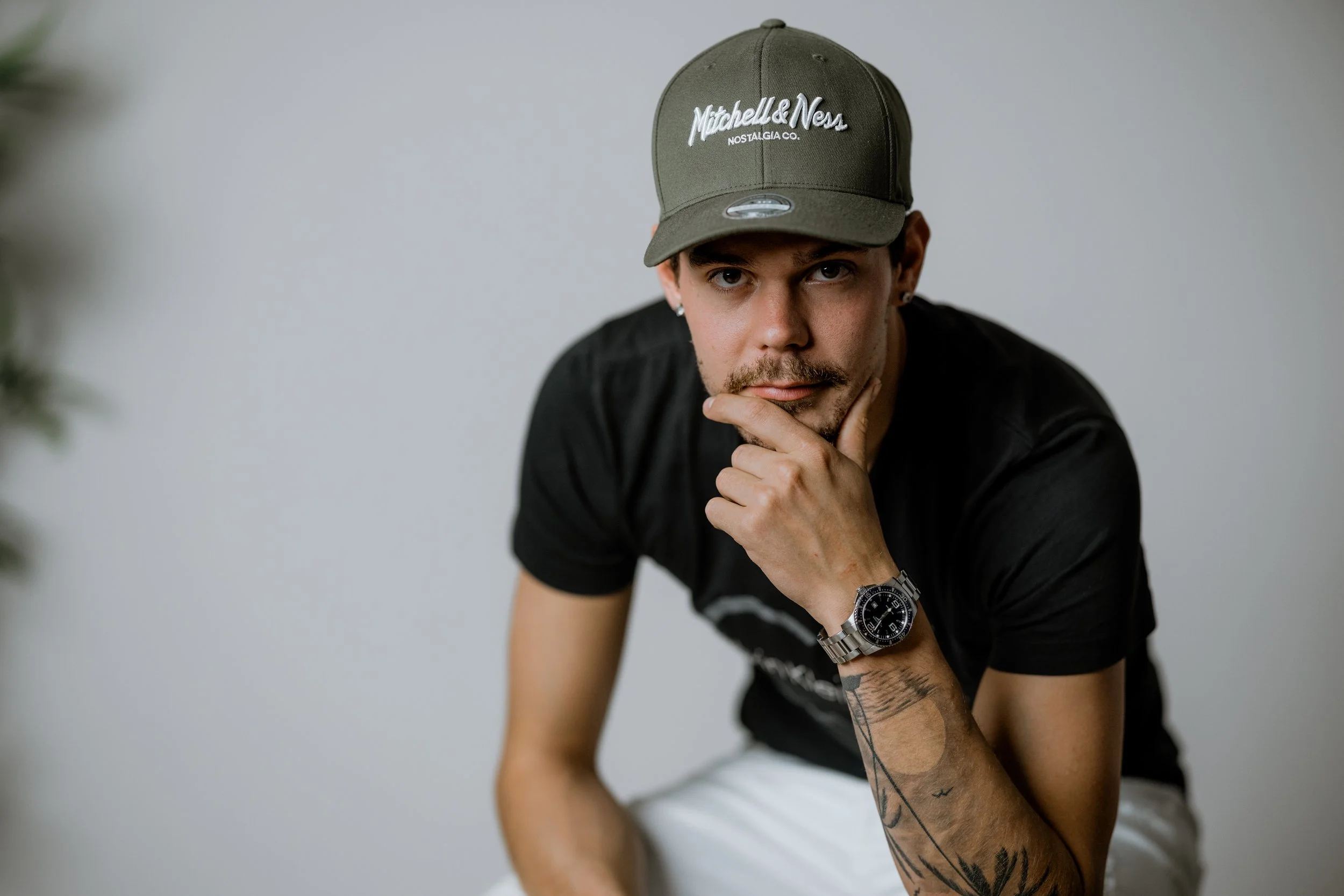 Junge Mann in schwarzem T-Shirt und grauem Cap mit weißen Aufschriften, trägt eine Armbanduhr, sitzt vor heller Wand, mit lockigem Bart und Tattoos am Arm, schaut nach vorne.
