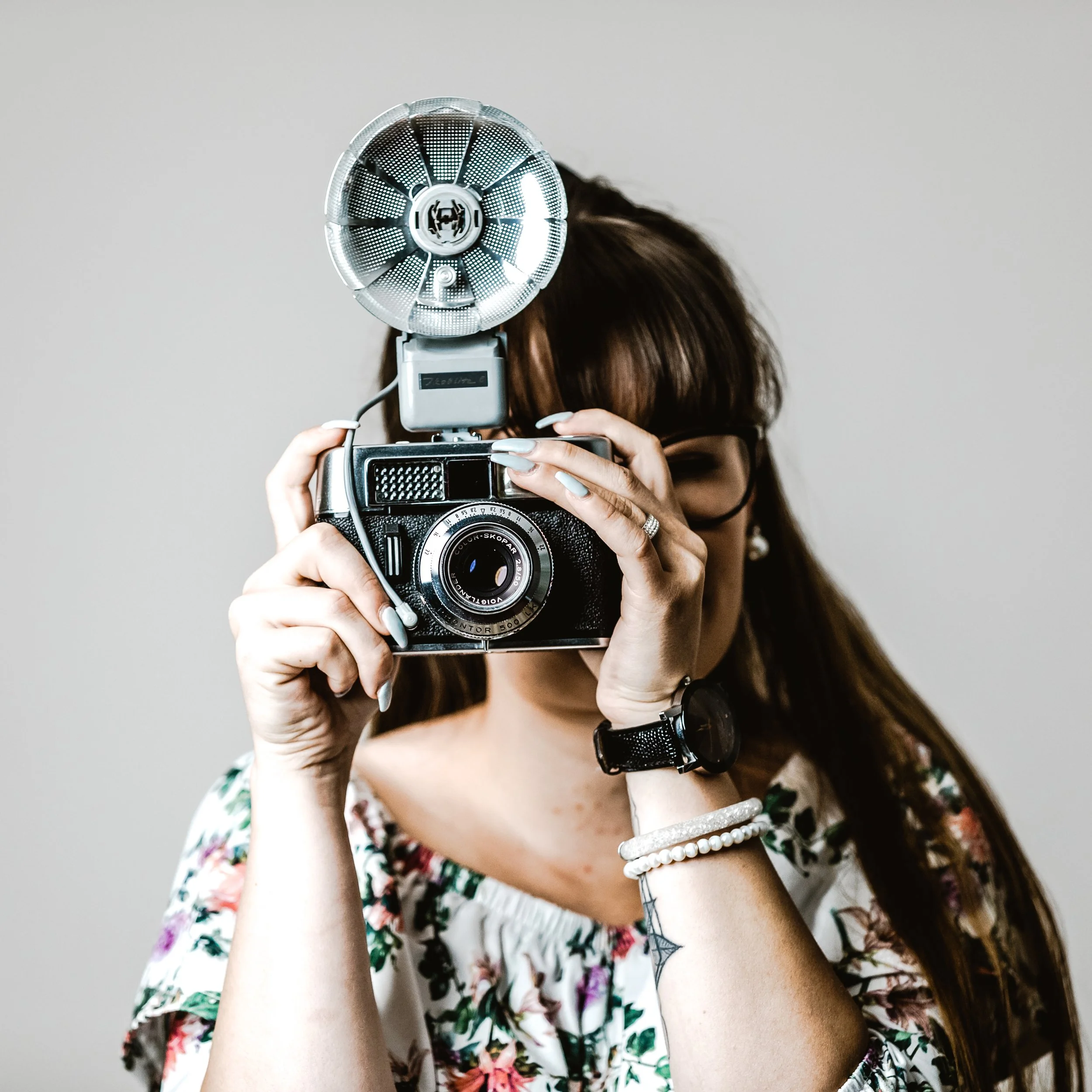 Eine Frau mit Brille hält eine Kamera mit einem Blitzgerät und richtet die Kamera auf den Betrachter