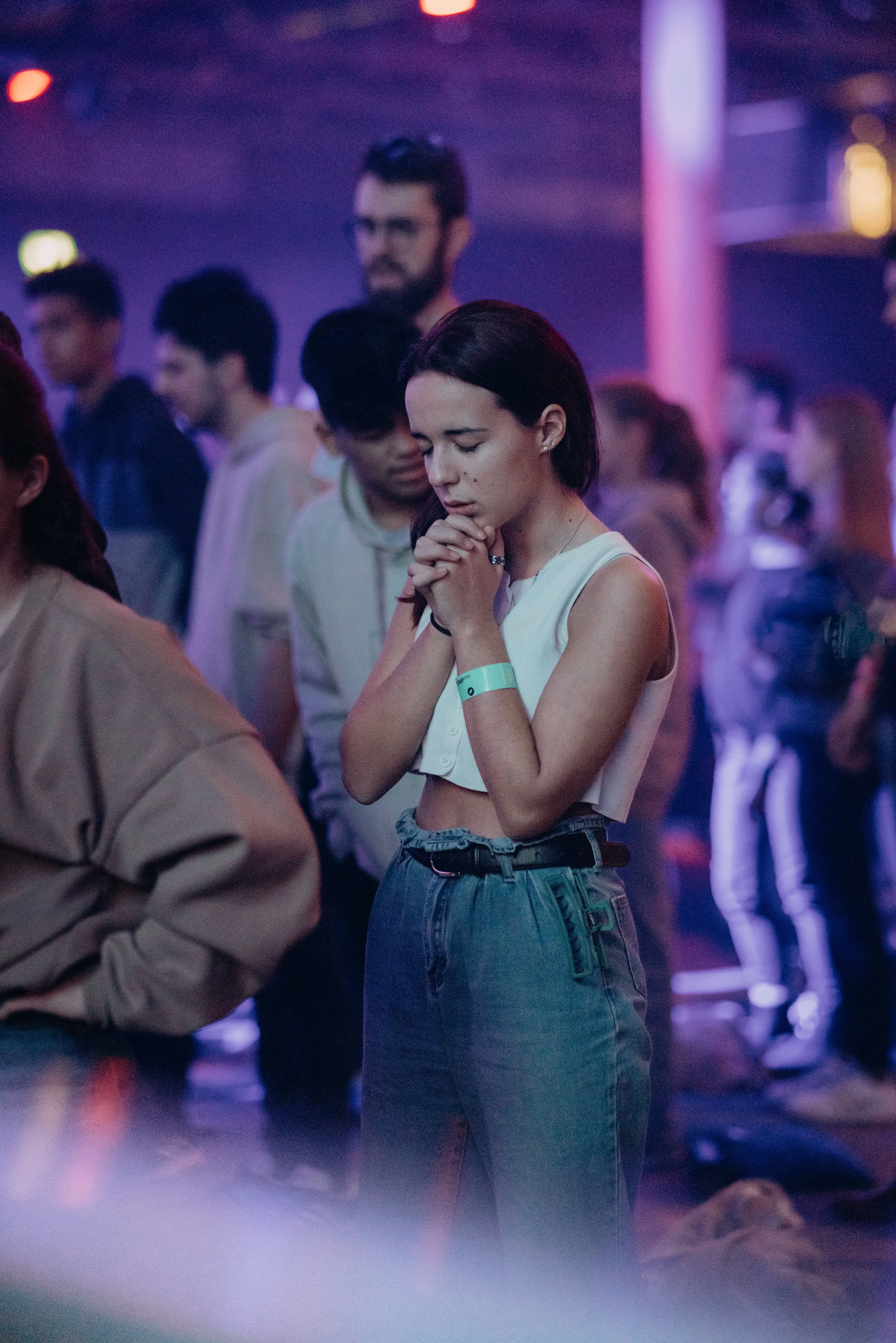 Junge Frau mit kurzen dunklen Haaren, die mit verschränkten Händen betet, in einer Gruppe von Menschen in einem dunklen, neonbeleuchteten Raum.