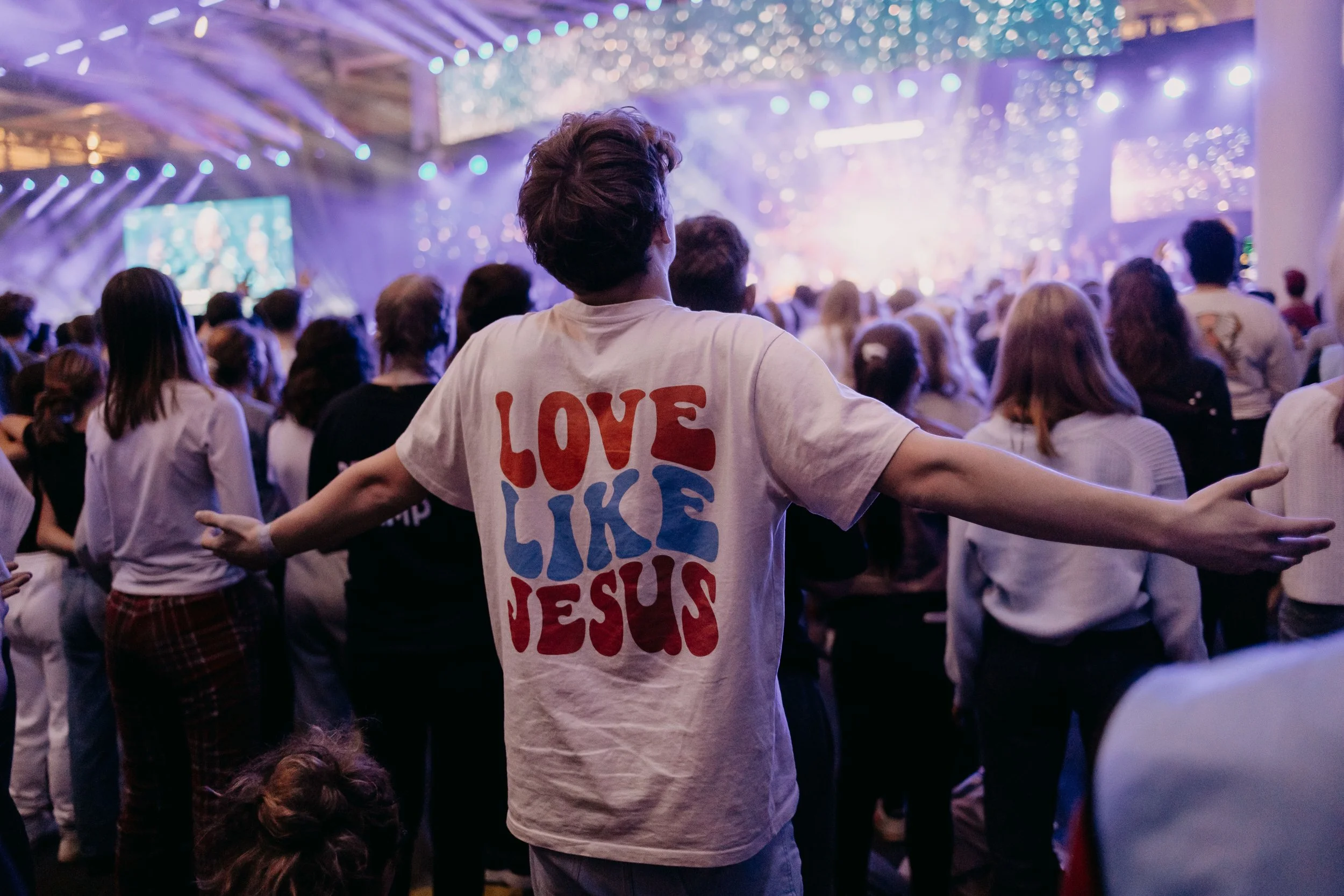 Jemand trägt ein T-Shirt mit dem Aufdruck "Love Like Jesus" bei einer Veranstaltung mit mehreren Menschen vor einer Bühne mit bunten Lichtern.