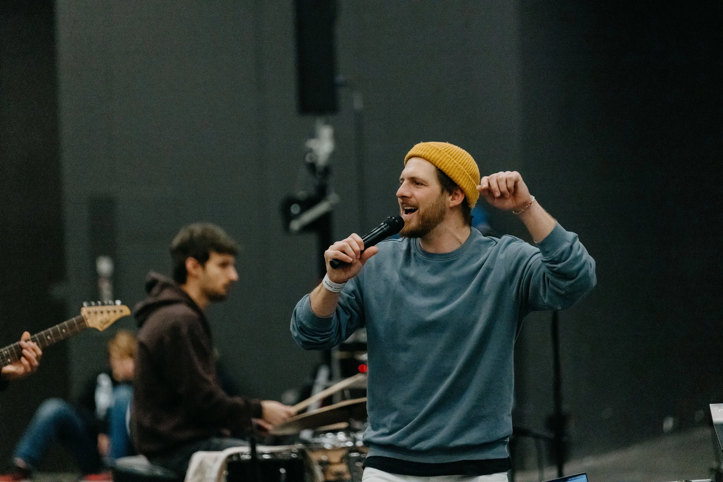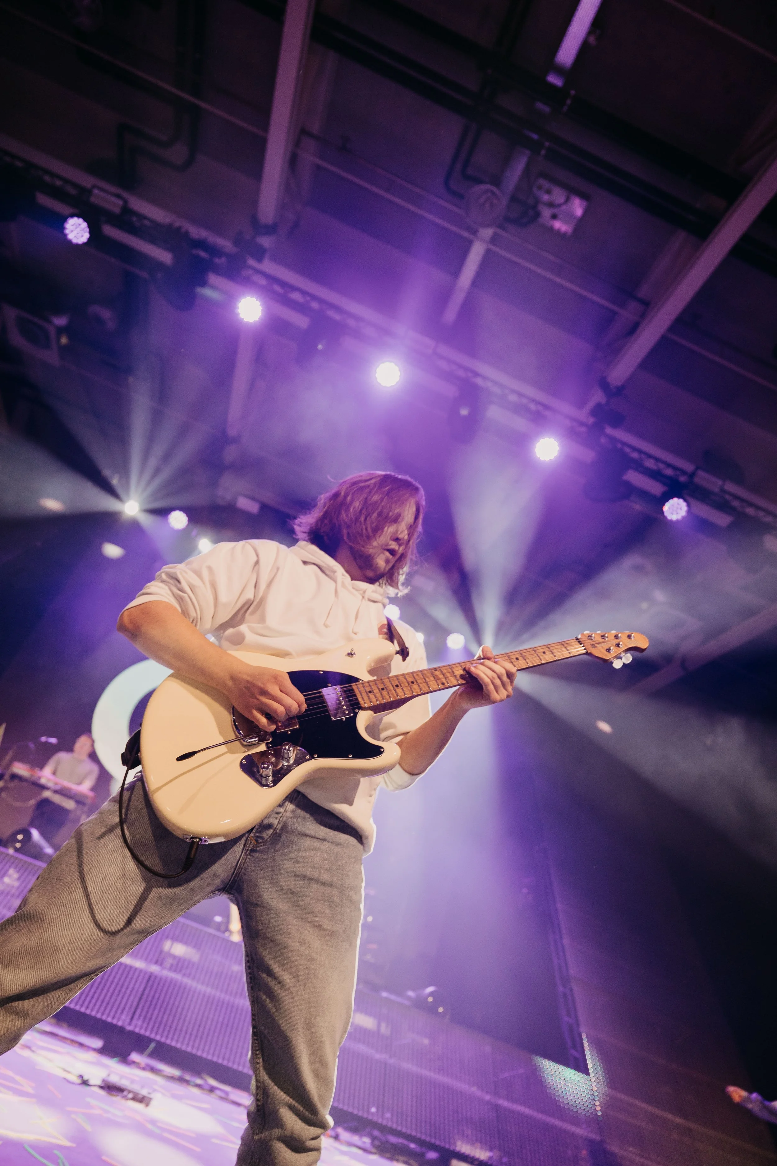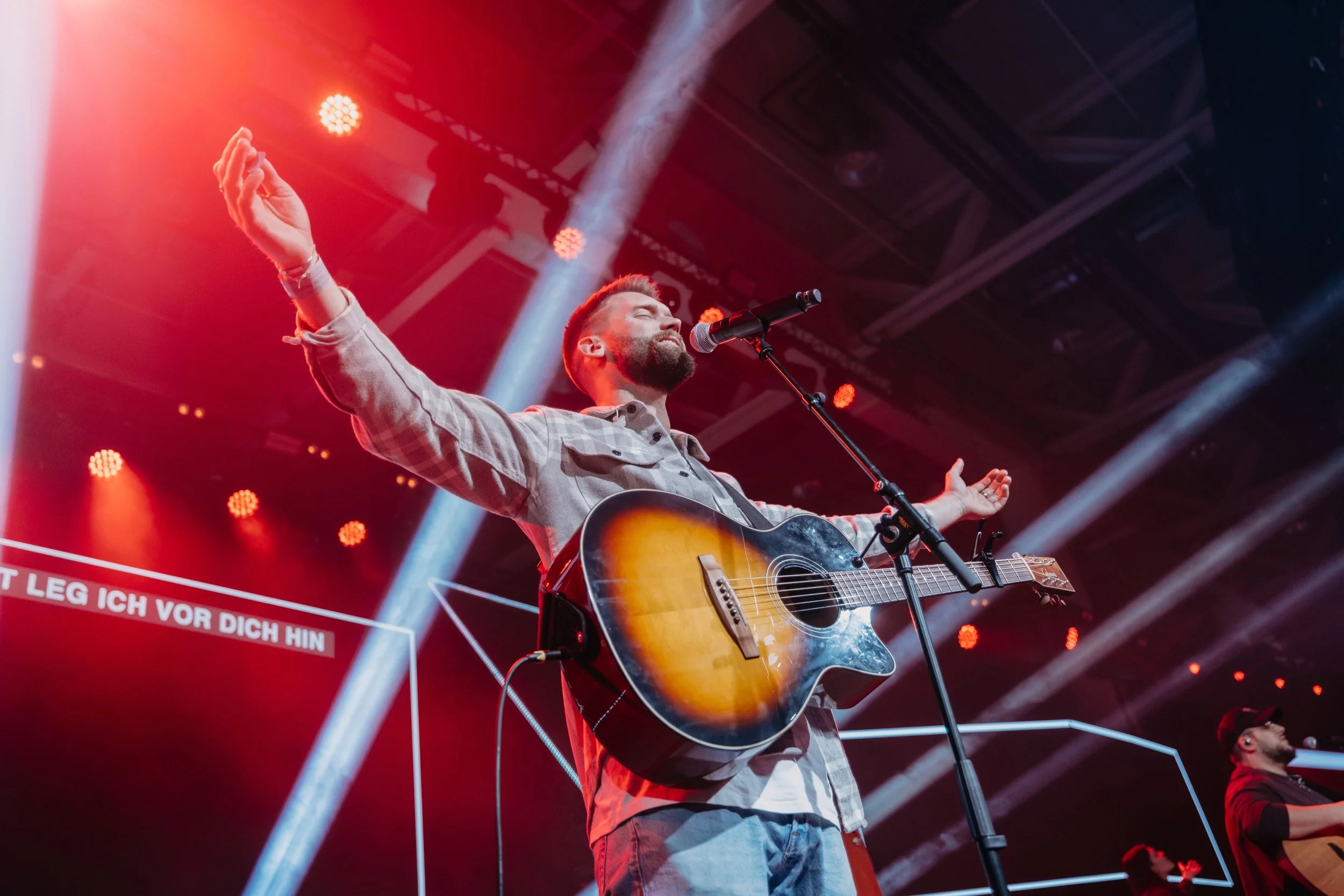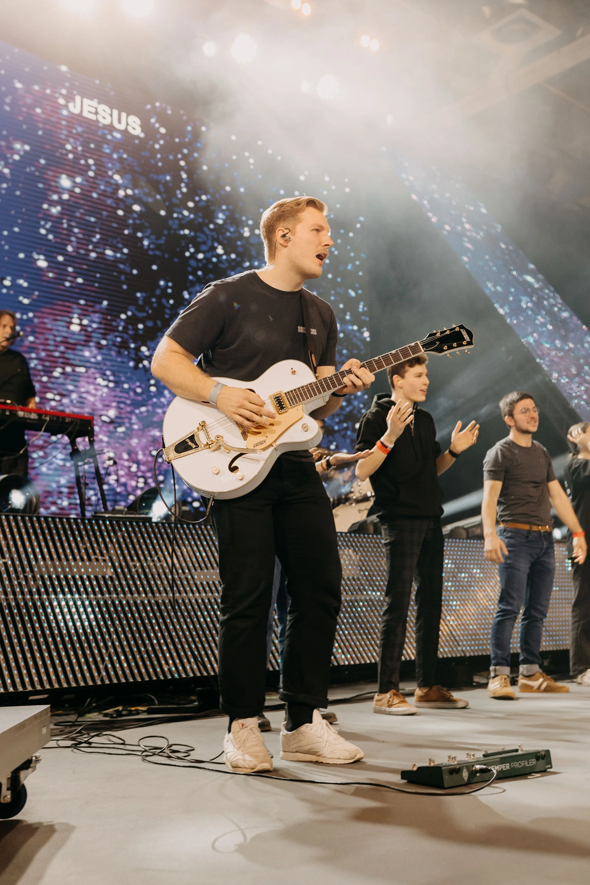 Junger Mann spielt Gitarre auf Bühne mit mehreren Menschen im Hintergrund, LED-Anzeige hinter ihm zeigt den Namen 'JESUS'.