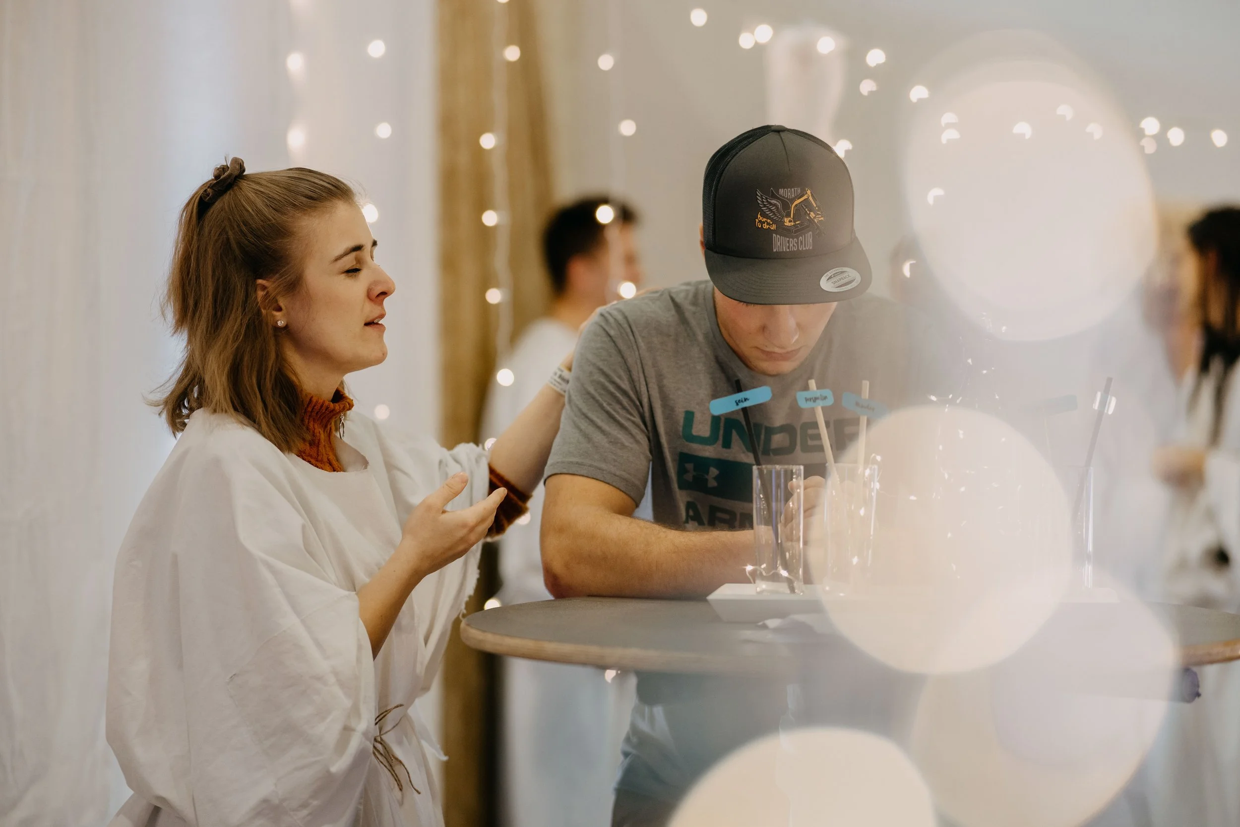 Zwei Menschen beim experimenting, ein Mädchen spricht und ein Junge schreibt, an einem hohen runden Tisch, im Hintergrund Lichter und andere Personen.