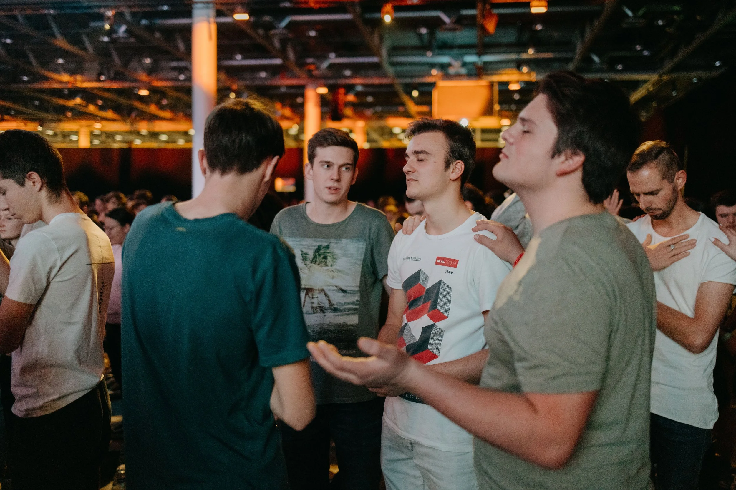 Eine Gruppe junger Menschen betet in einer dunklen, beleuchteten Umgebung.