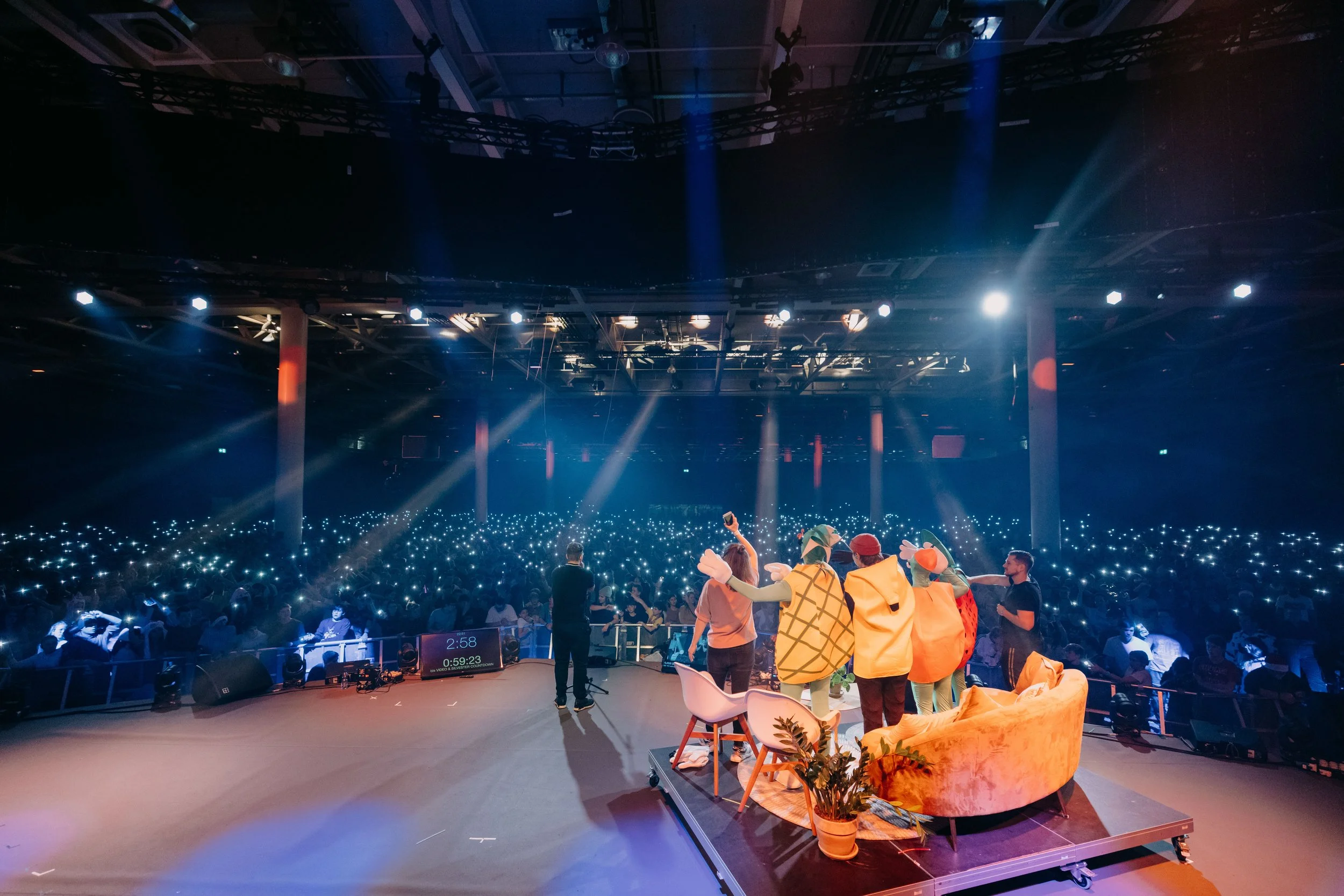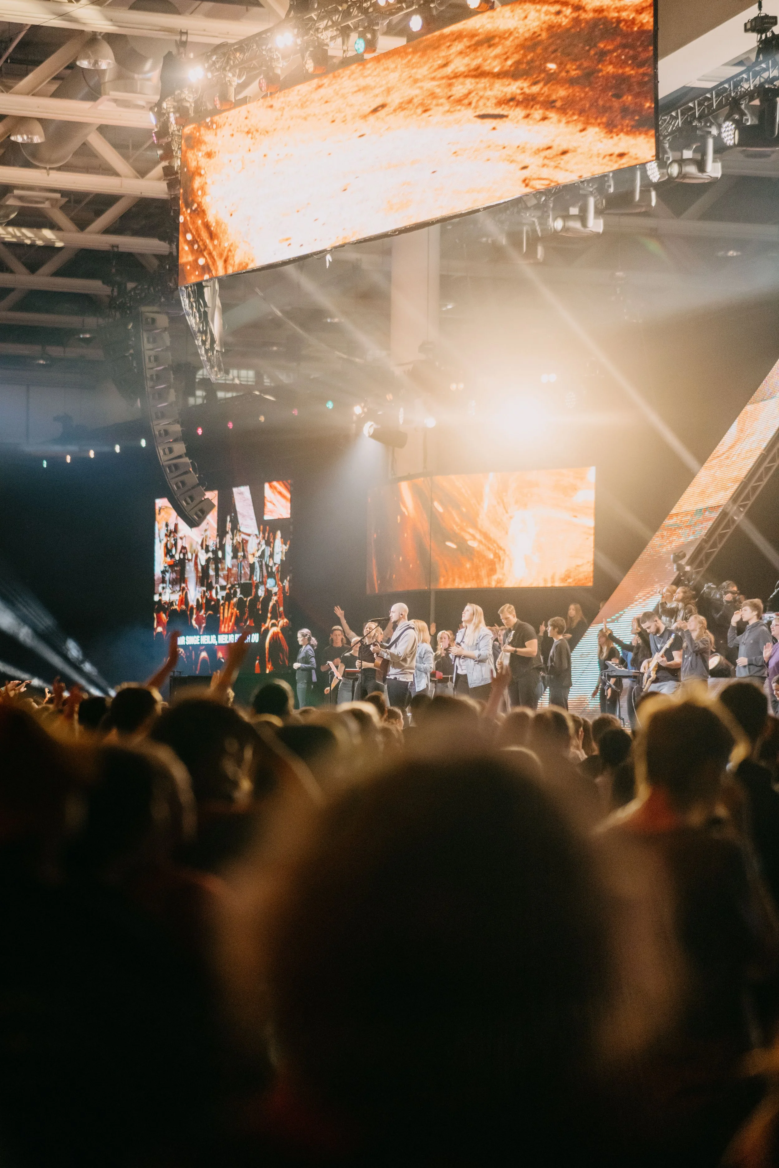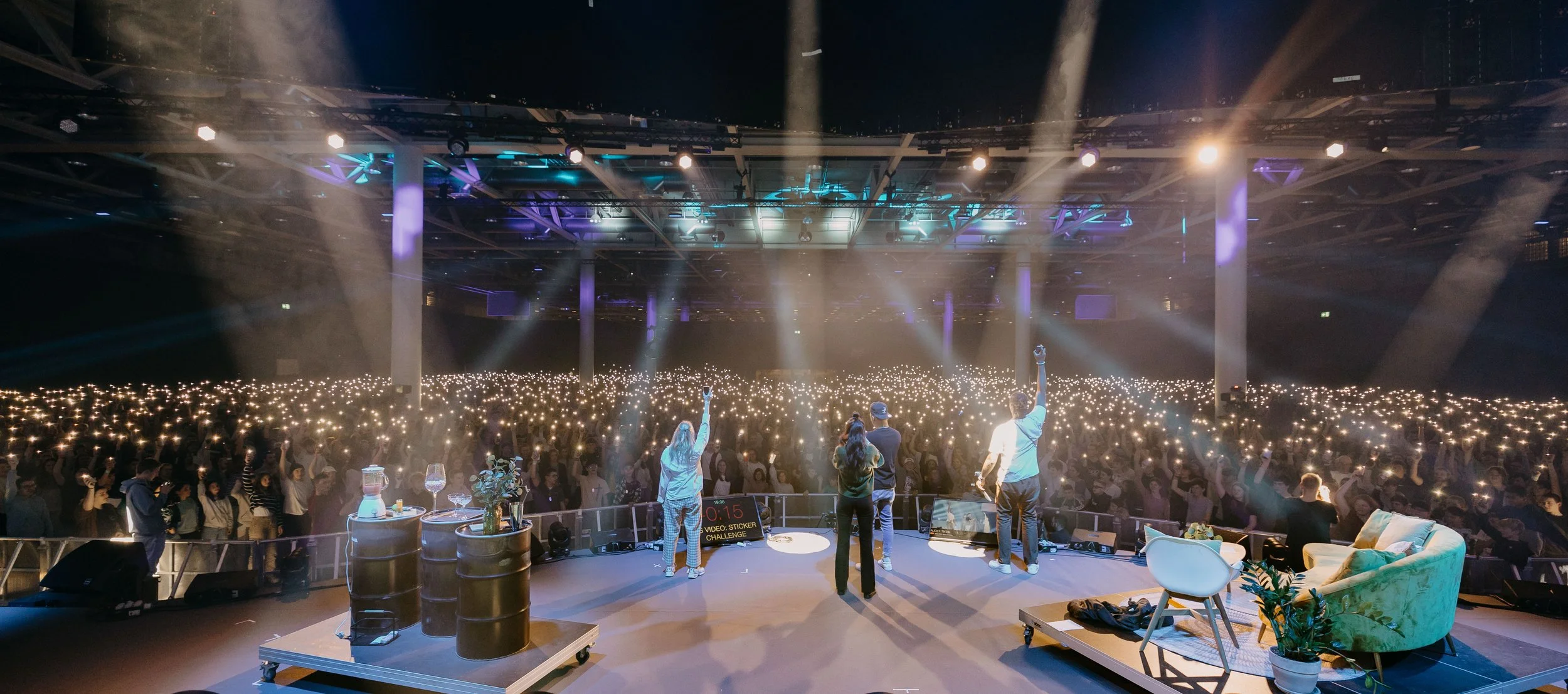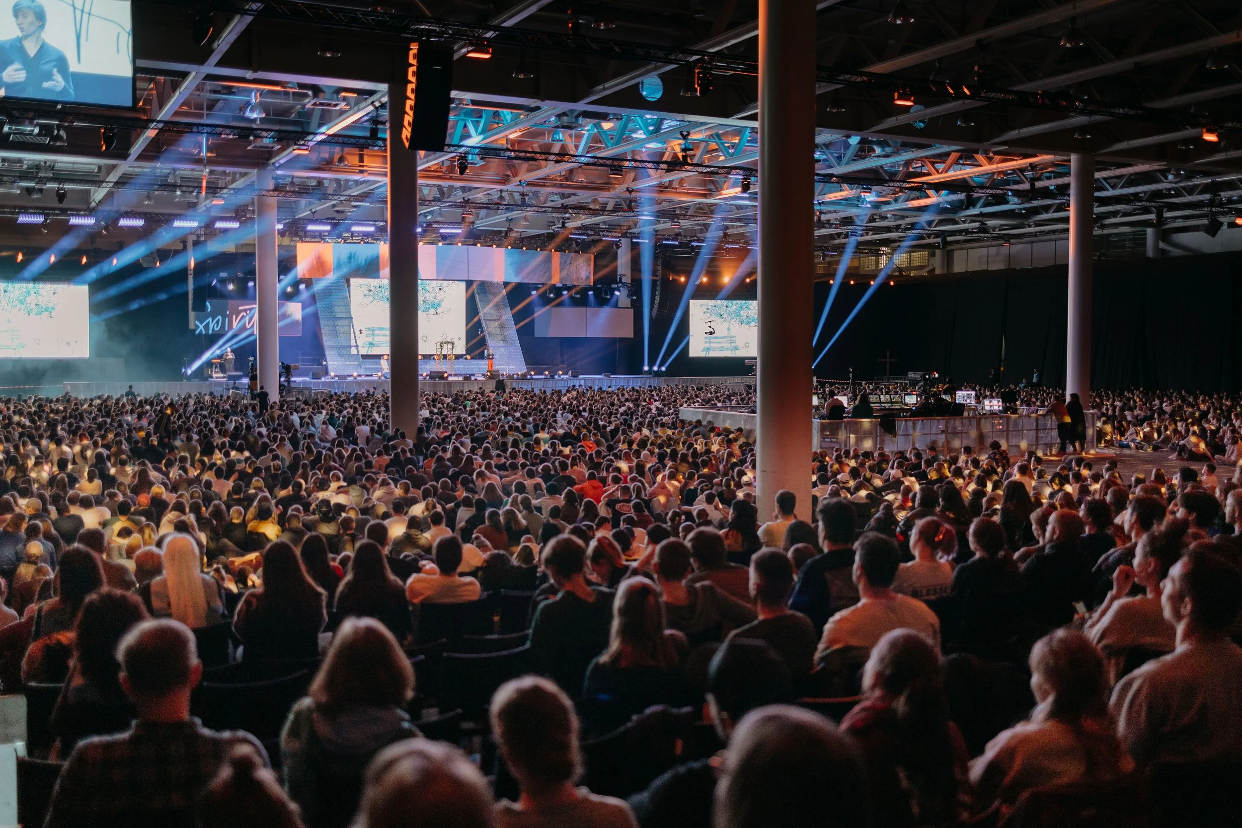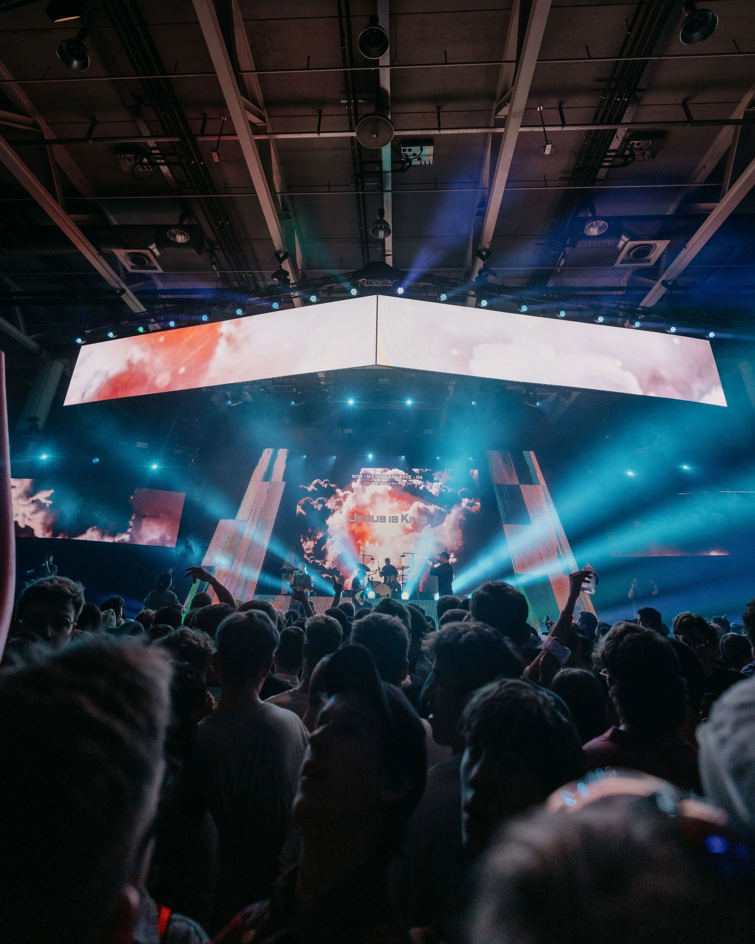 Bühne bei einem Konzert oder einer religiösen Veranstaltung mit einem großen Publikum, auf der LED-Leinwände und Lichterstrahlen sichtbar sind, mit Text "Jesus ist König" auf der zentralen Leinwand.