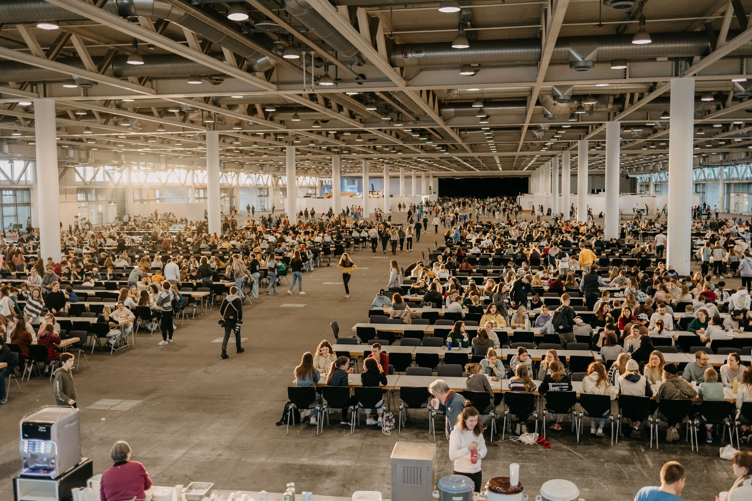 Ein großer, heller Raum mit vielen Menschen, die an Tischen sitzen, essen und trinken. Es sieht aus wie ein Messe- oder Eventraum mit Industrie-Design und hohem Decken. Im Vordergrund gibt es einen Servicebereich mit Geräten und einer Gruppe von Mens