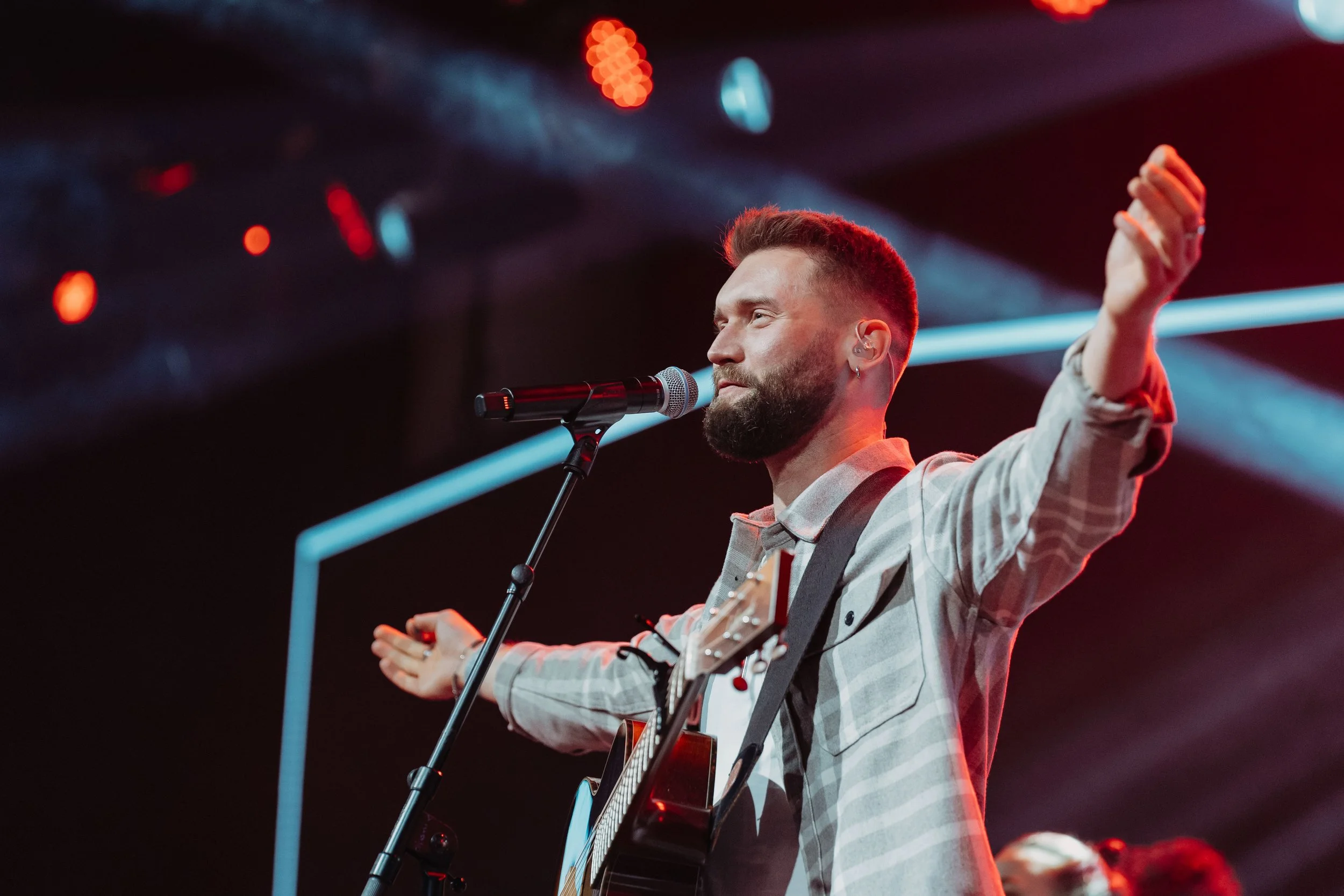 Mann mit Kurzhaarschnitt und Bart, der auf einem Konzert mit Gitarre auftritt, vor einem Mikrofon, mit ausgestreckten Armen, bei buntem Bühnenlicht.