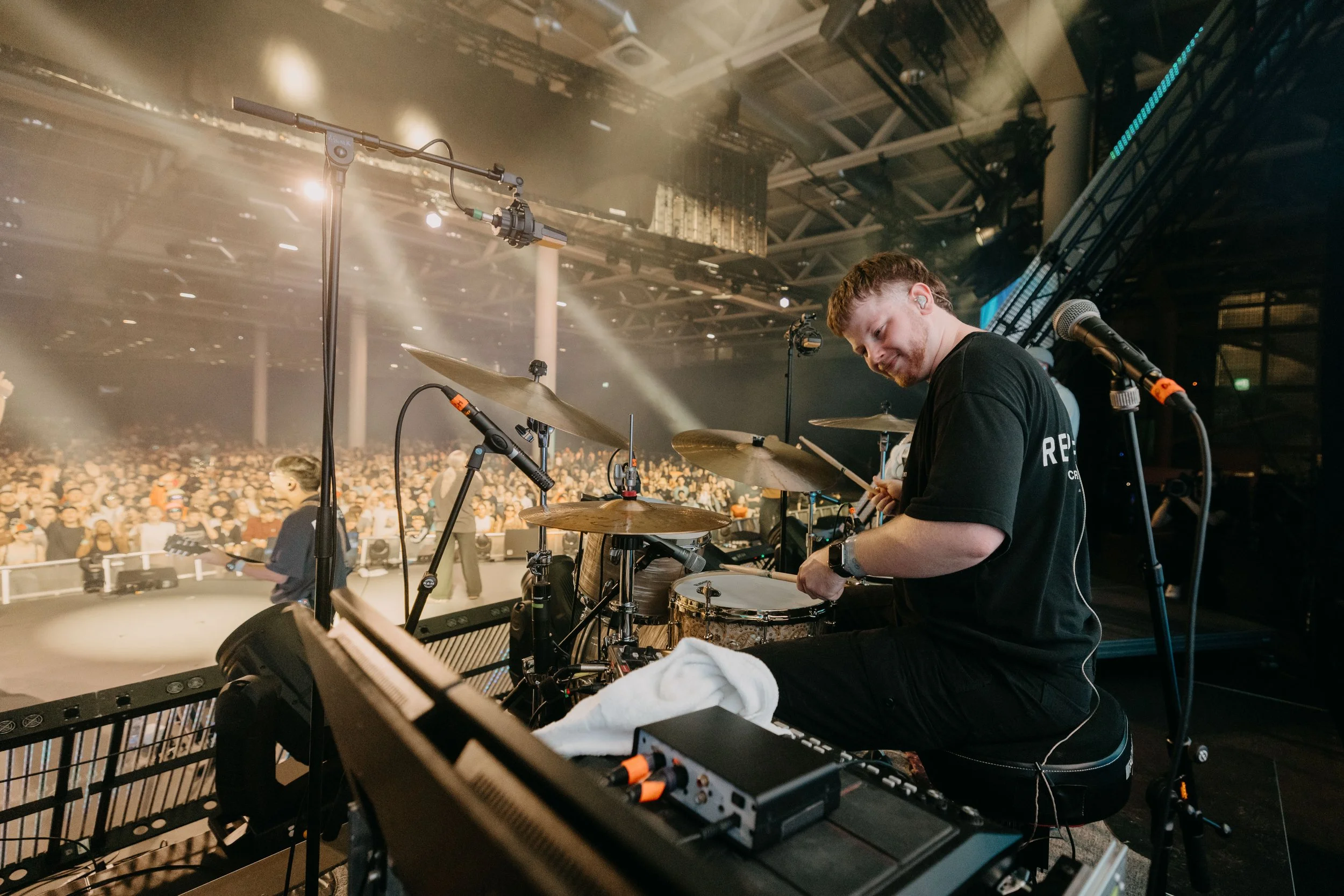 Ein Musiker spielt auf einem Drum-Set während eines Konzerts vor einem großen Publikum in einer Indoor-Arena.