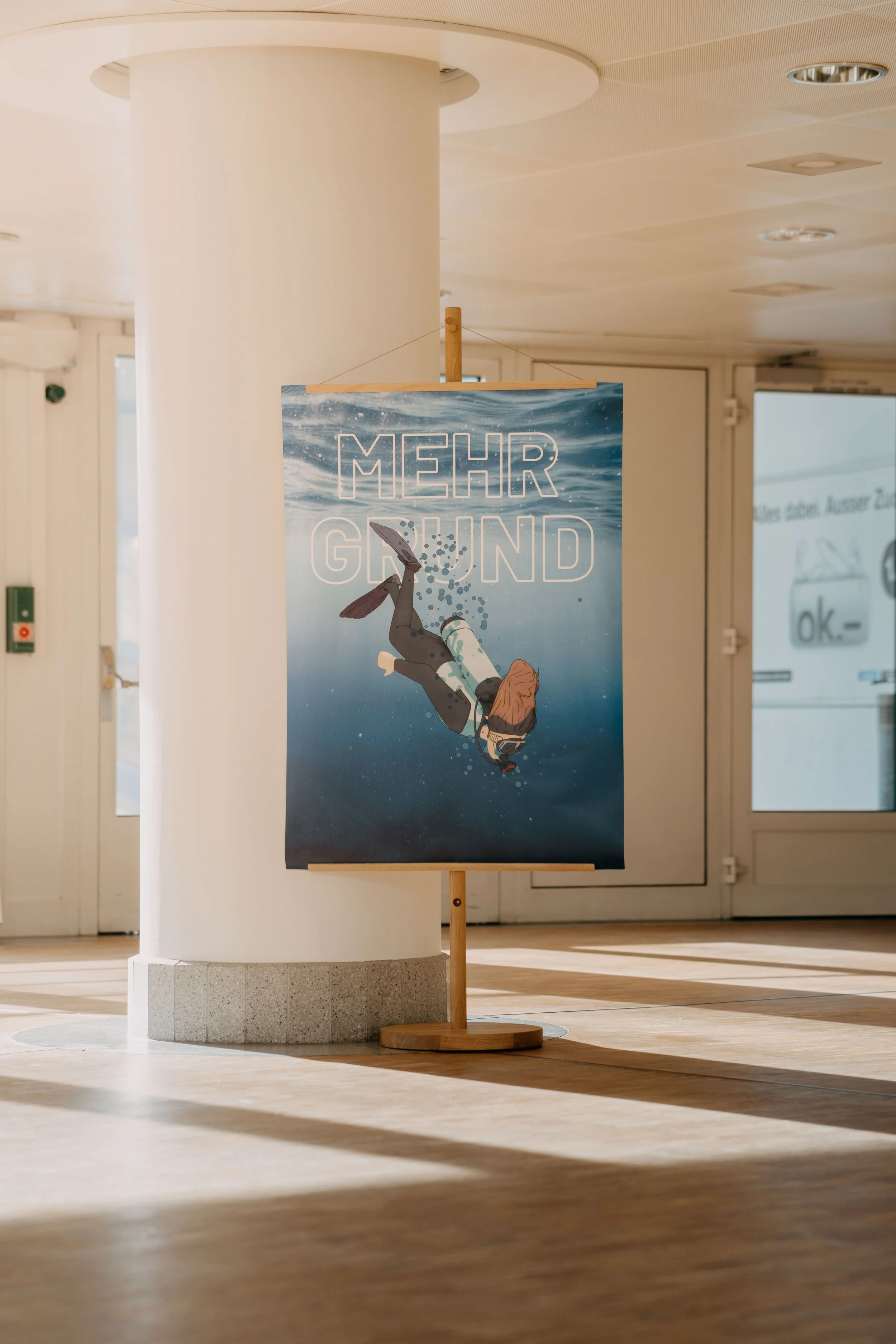 Bild eines Standes mit einem Plakat, auf dem eine Taucherin unter Wasser zu sehen ist und der Text 'MEHR GRUND' steht.