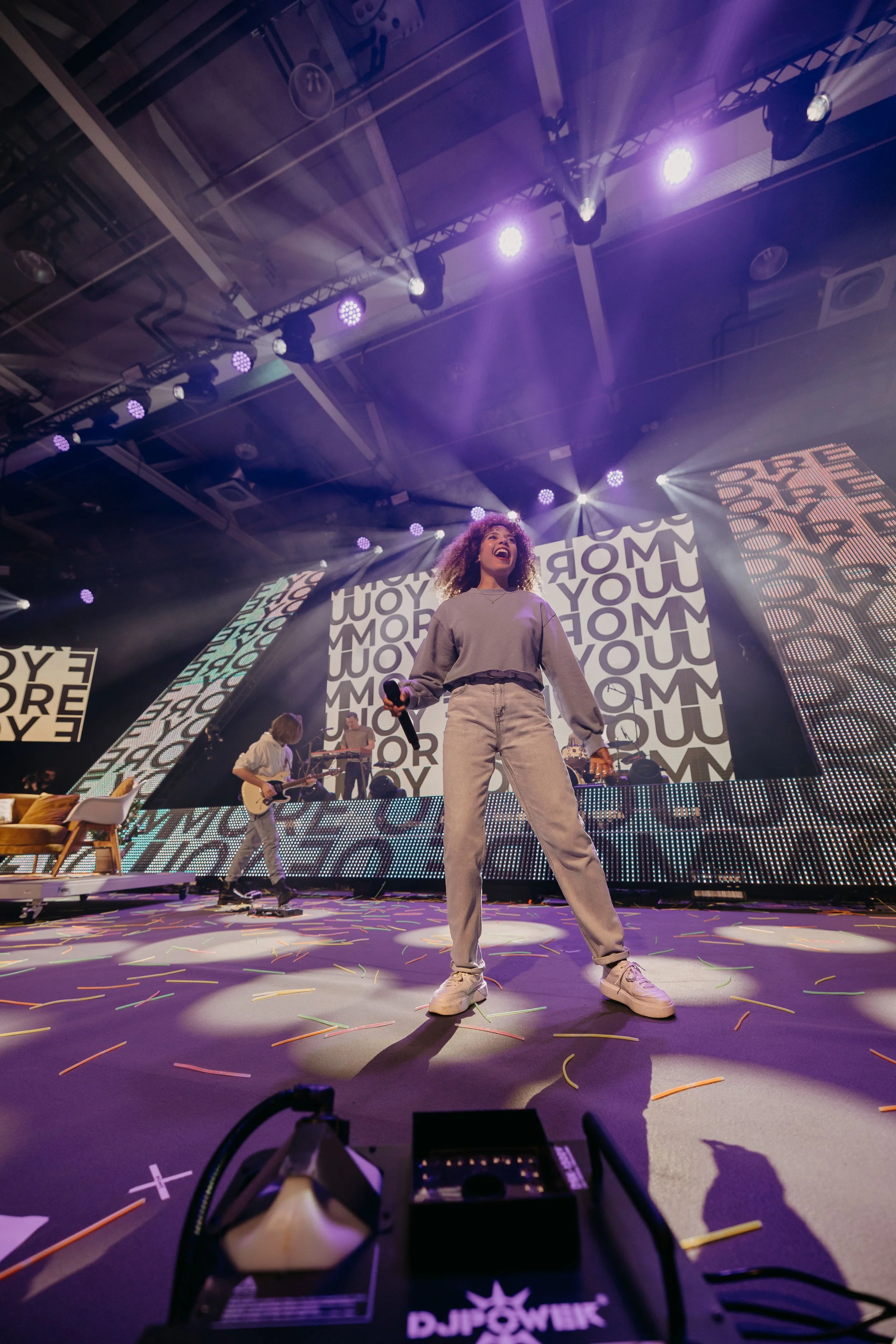 Junge Frau auf einer Bühne mit Mikrofon, im Hintergrund Band, bunte Lichter und große Bildschirme mit Texten, auf der Bühne liegen bunte Konfetti.