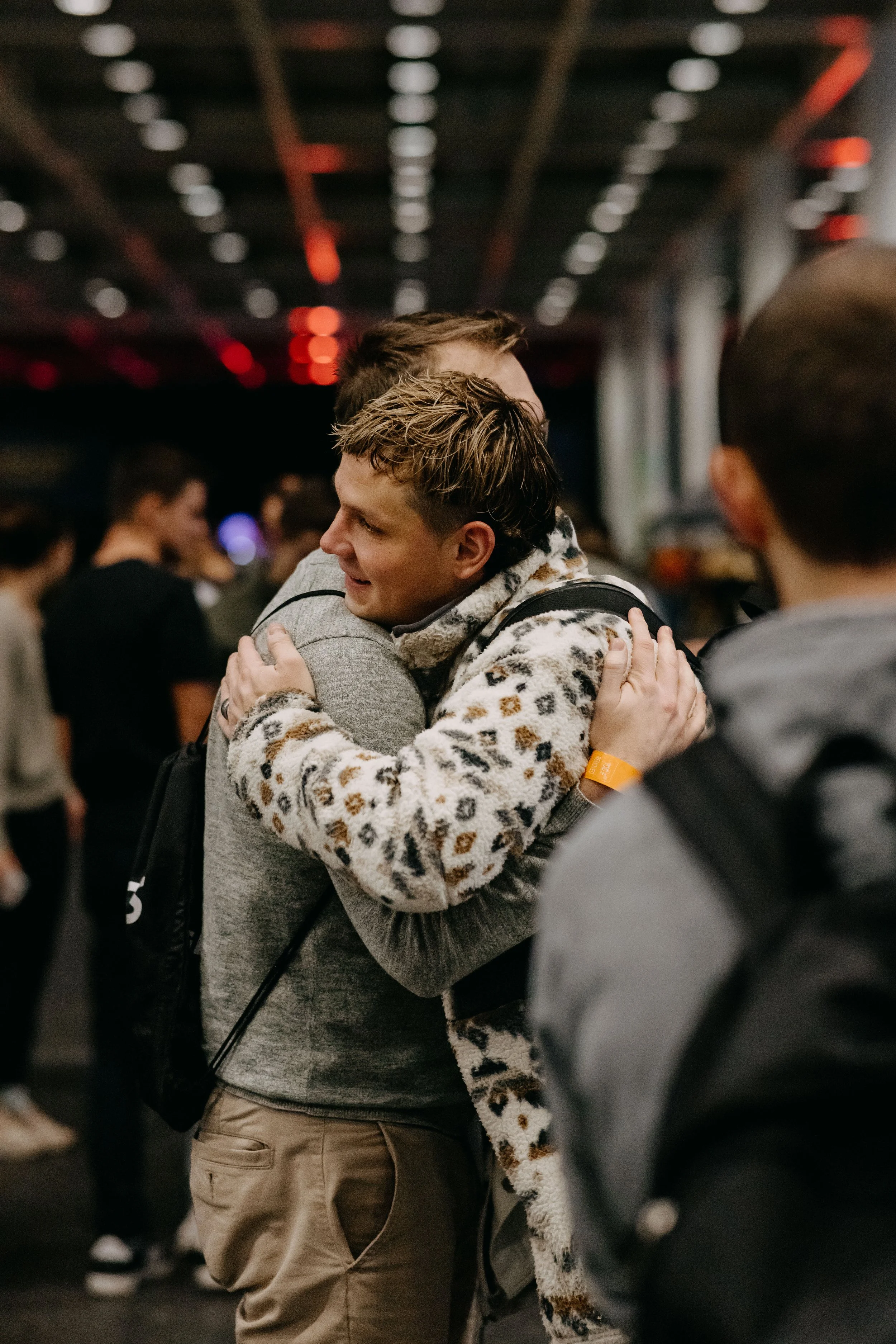 Zwei Menschen umarmen sich bei einem Treffen in einem dunklen, belebten Raum.
