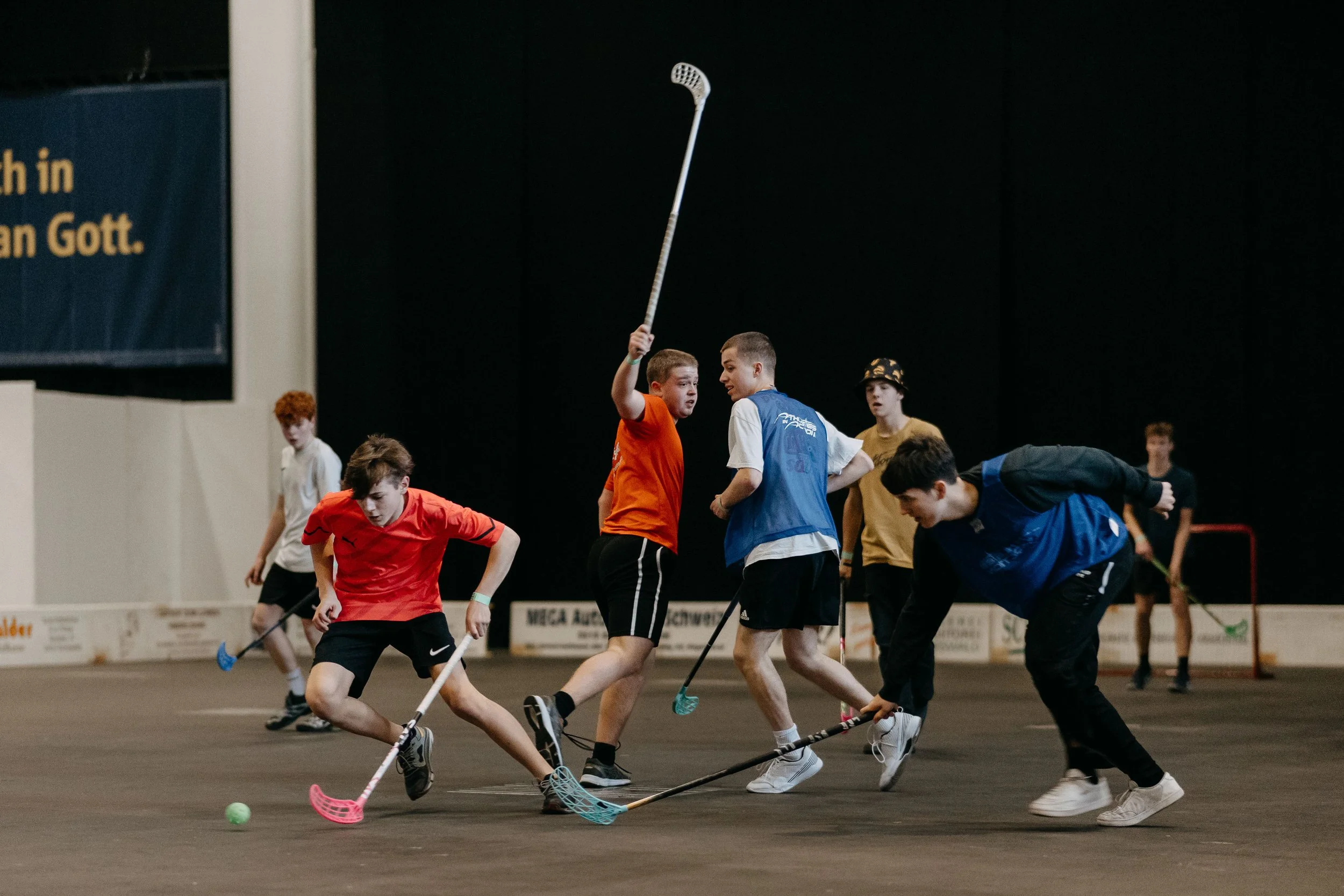 Junge spielen Floorball in einer Halle, zwei Leute versuchen, den Ball zu kontrollieren, während andere zuschauen.