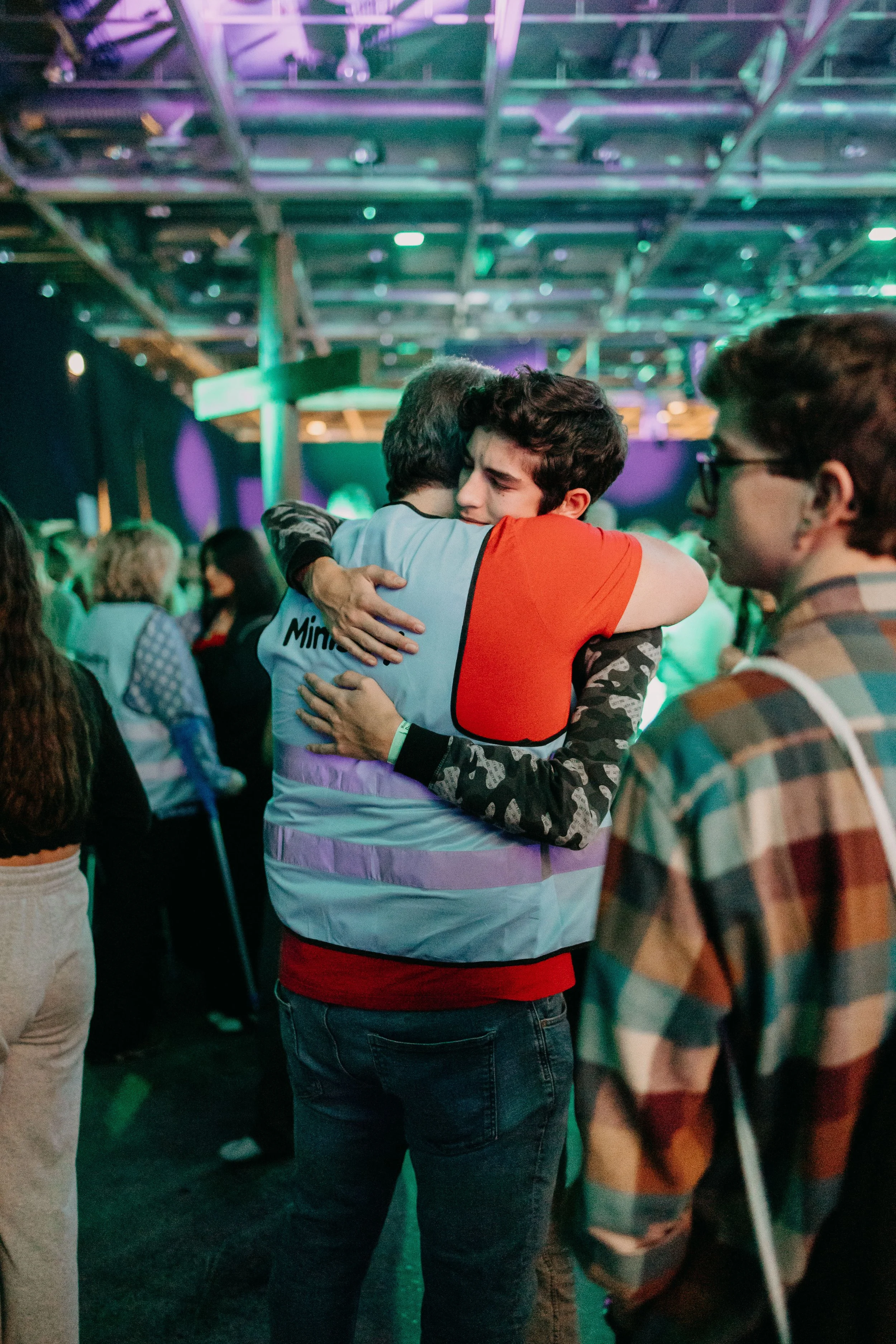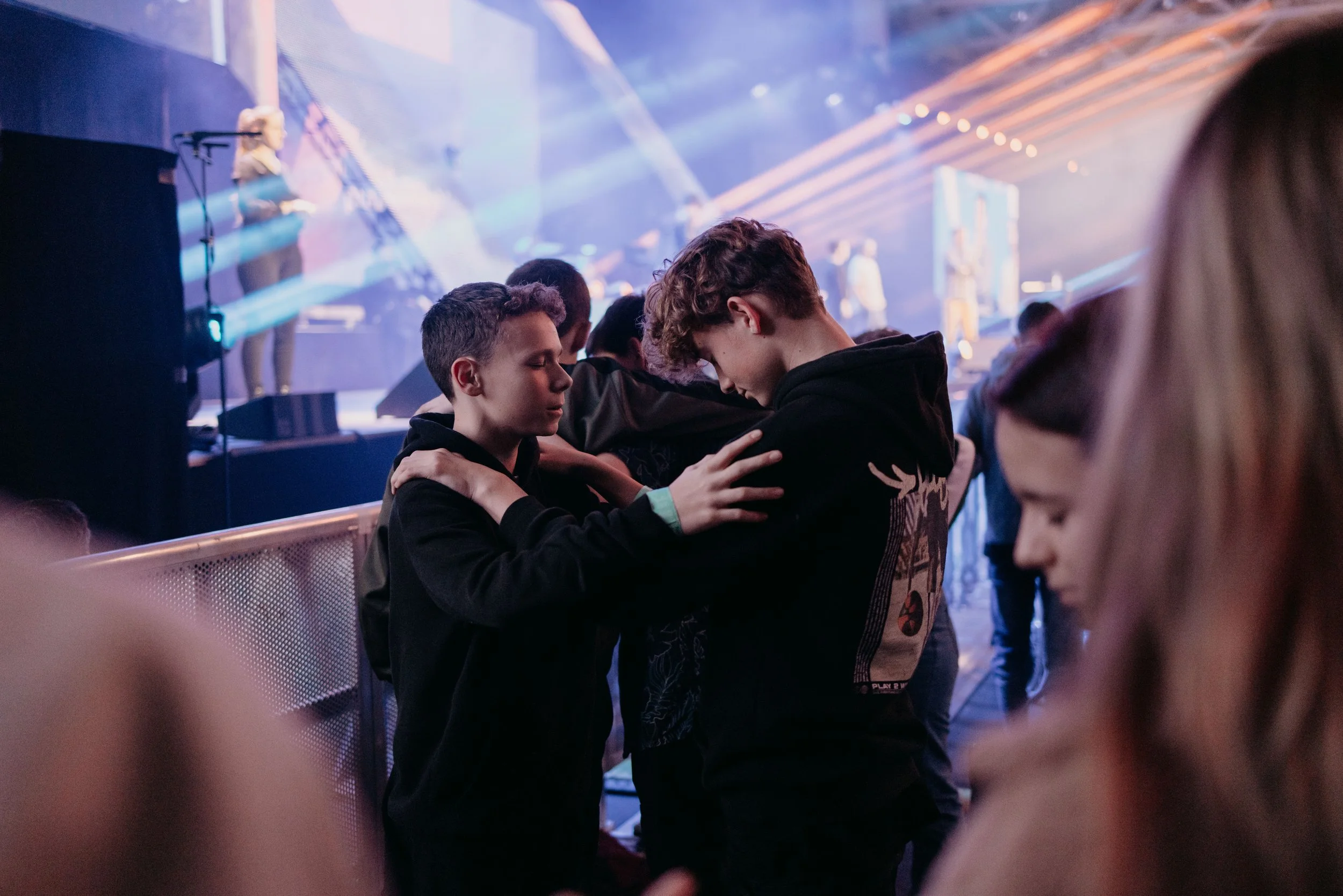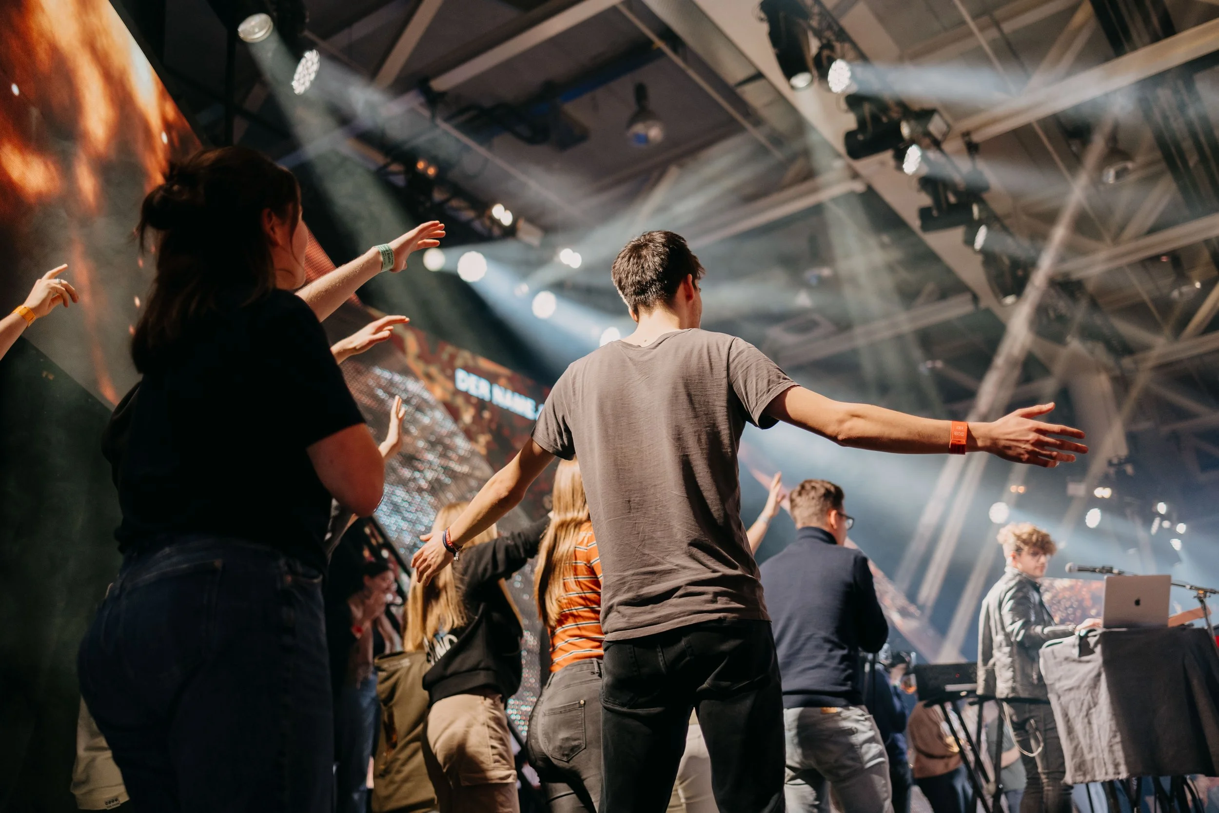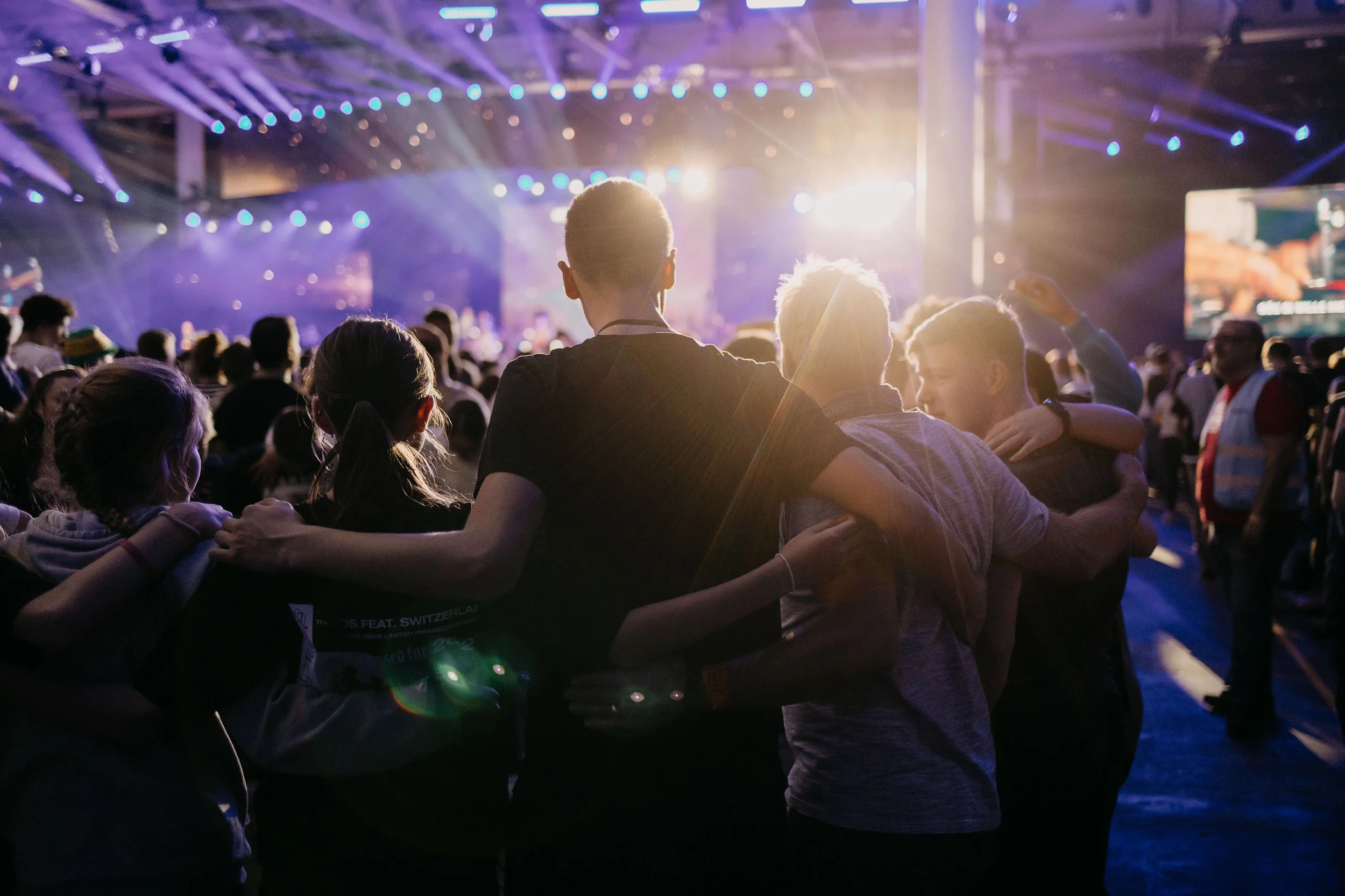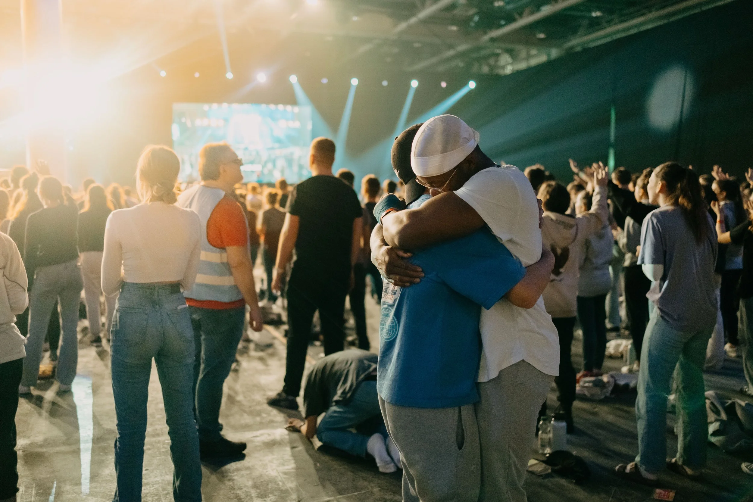 Menschen im Konzert- oder Gottesdienstsaal, einige umarmend, mit Bühne und Lichteffekten im Hintergrund.