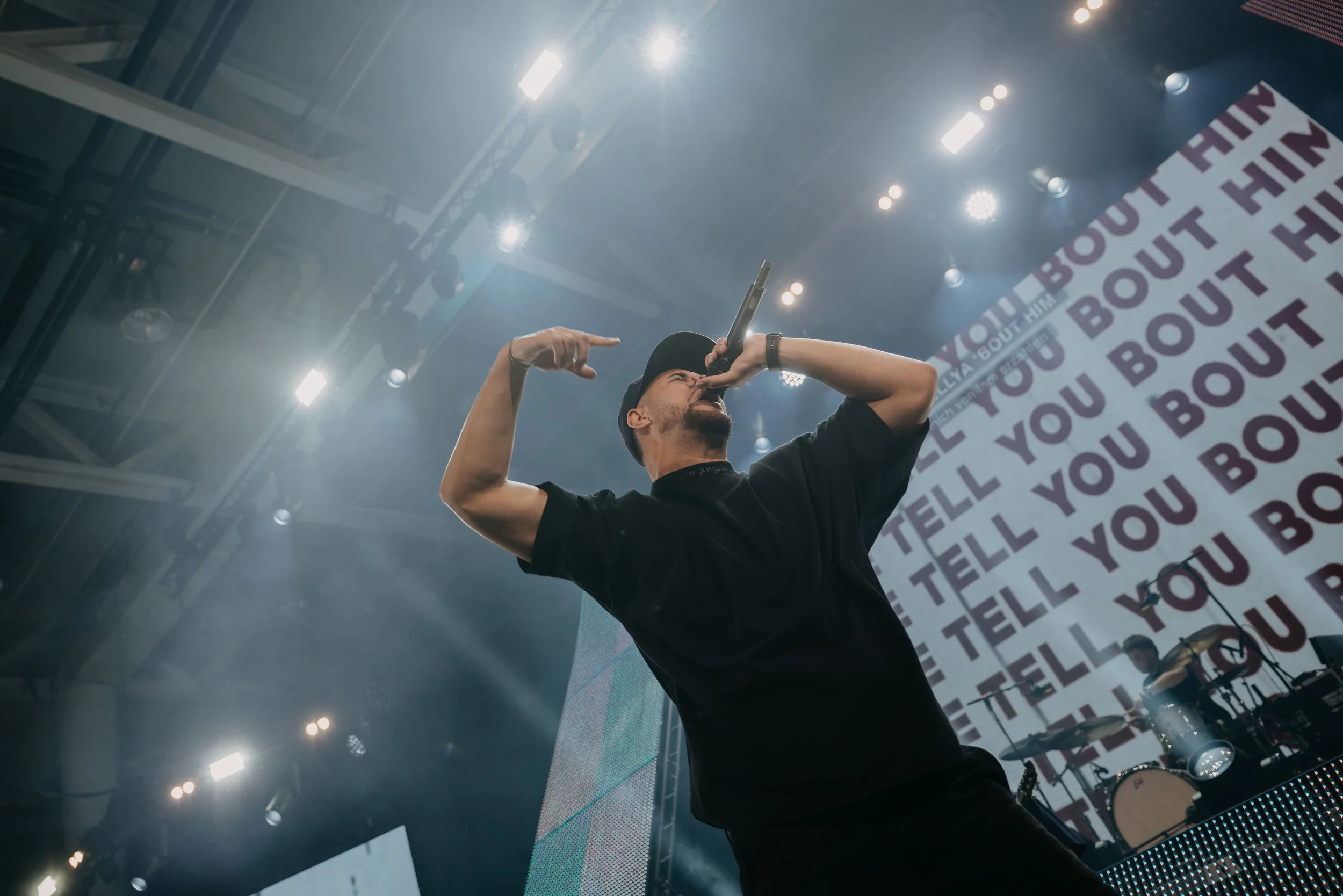 Ein Sänger mit Sonnenbrille und schwarzem Outfit singt in einem Konzert, während er ein Mikrofon hält. Im Hintergrund ist ein Bildschirm mit der Aufschrift 'TELL YOU BOUT' zu sehen, und ein Schlagzeug ist sichtbar.