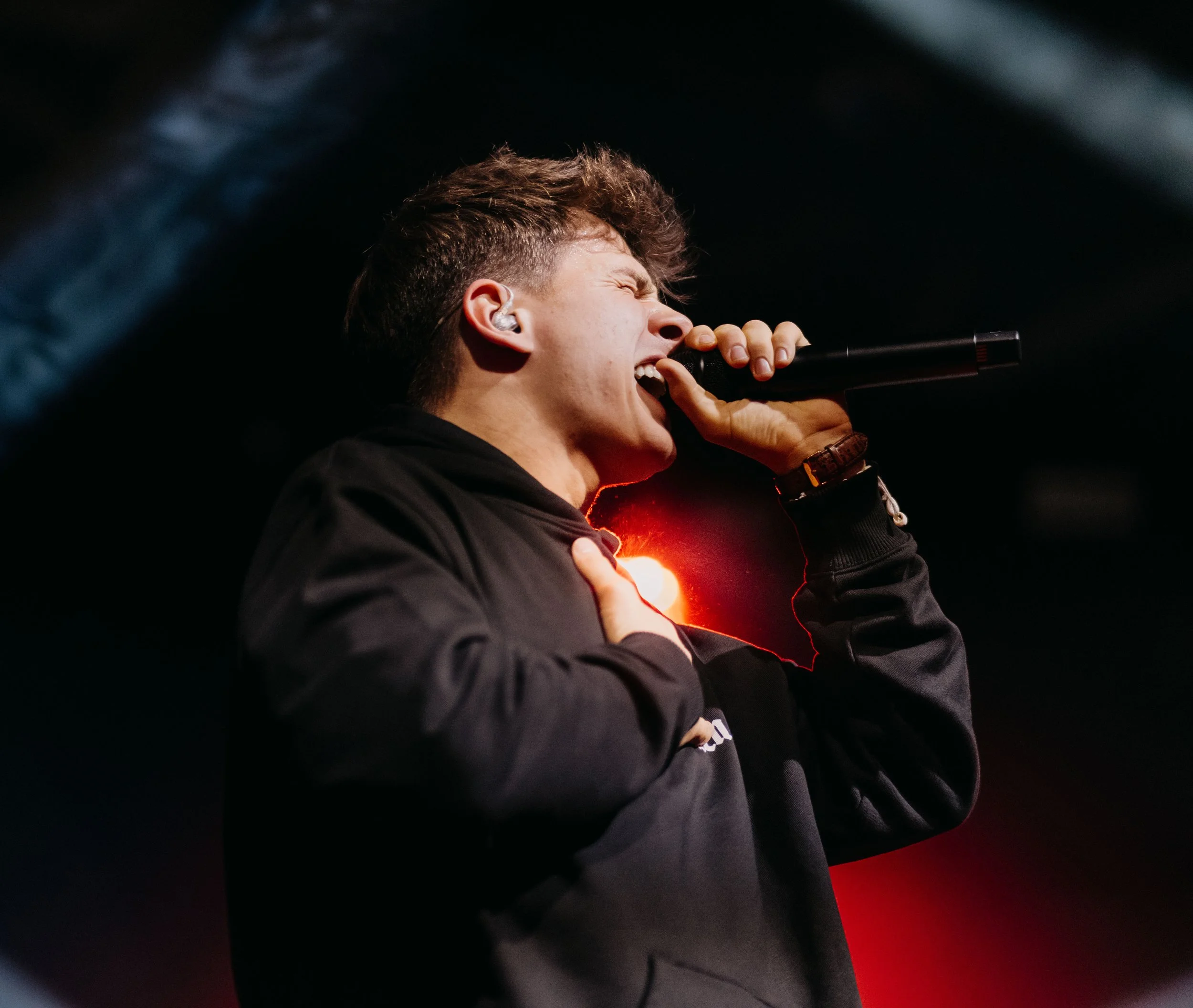 Ein junger Mann singt leidenschaftlich in ein Mikrofon, während er auf einer Bühne steht, mit rot und blau beleuchtetem Hintergrund.