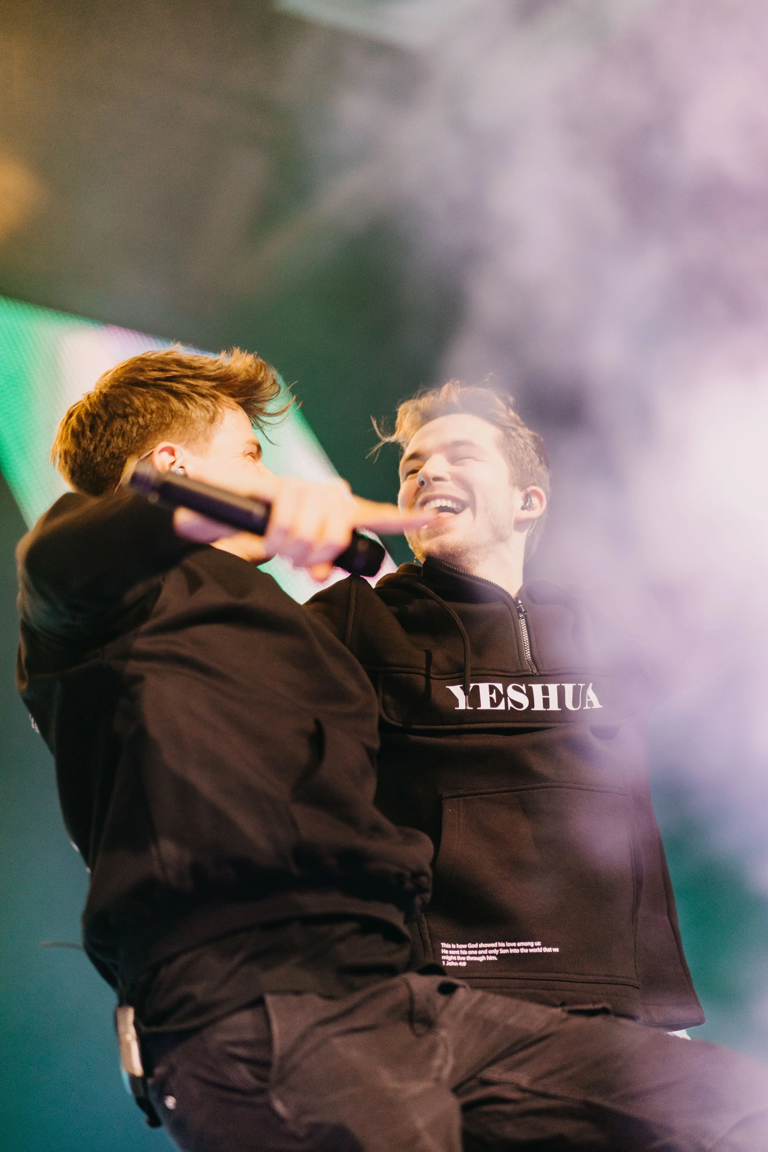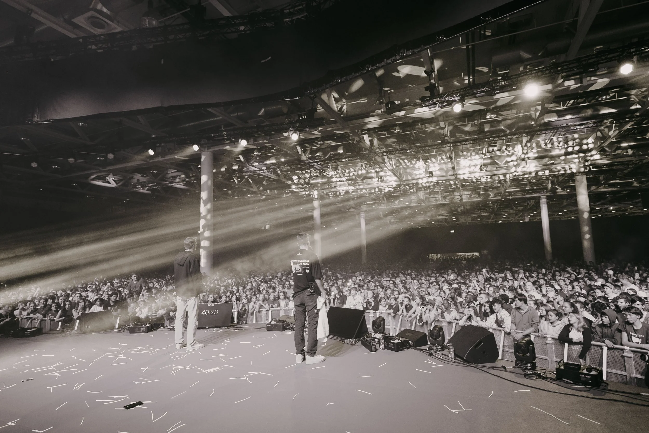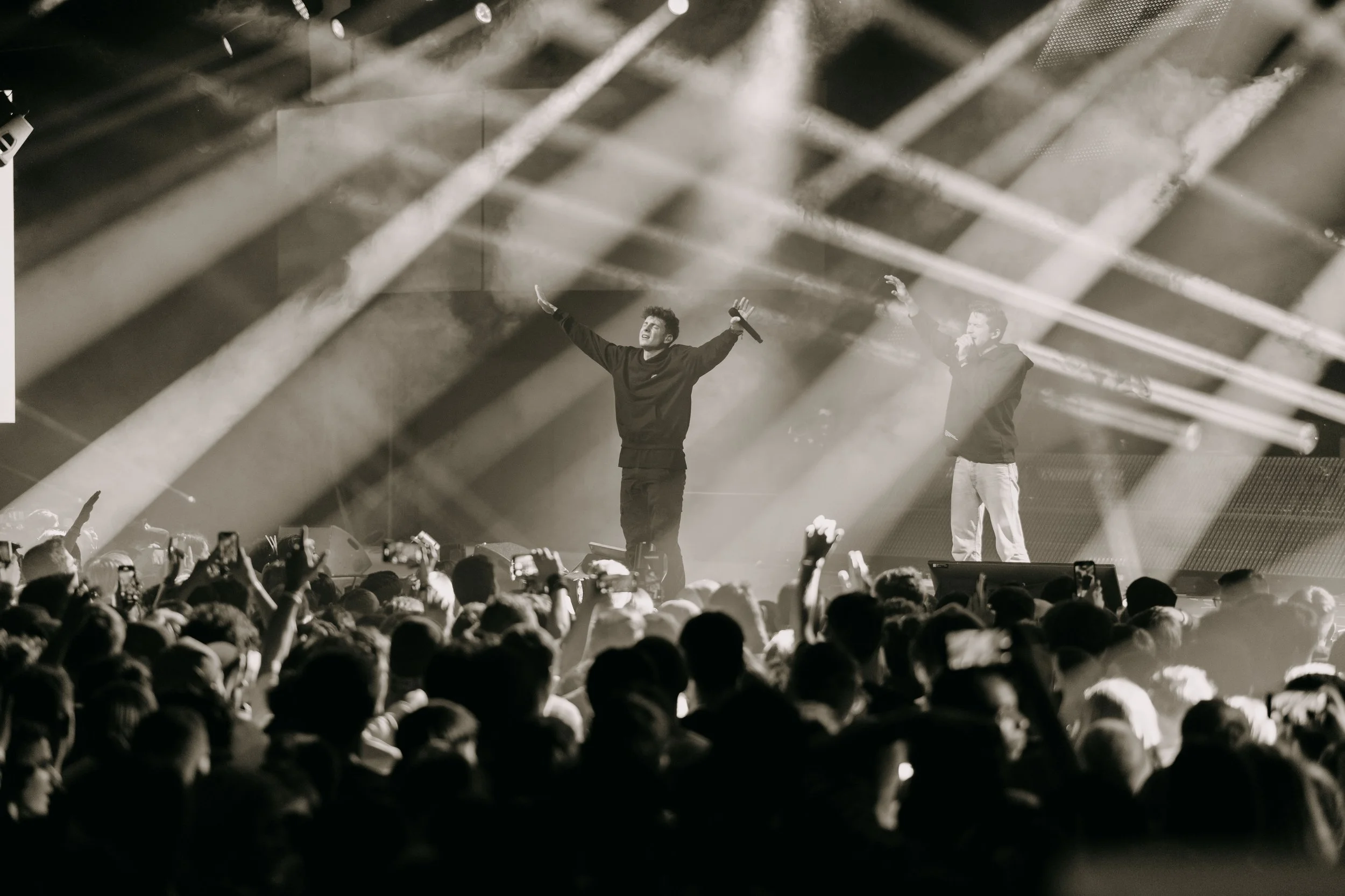 Zwei Männer stehen auf einer Bühne, umgeben von einem Publikum, mit Scheinwerfern und Lichtstrahlen, die auf sie gerichtet sind, bei einem Konzert oder Event.
