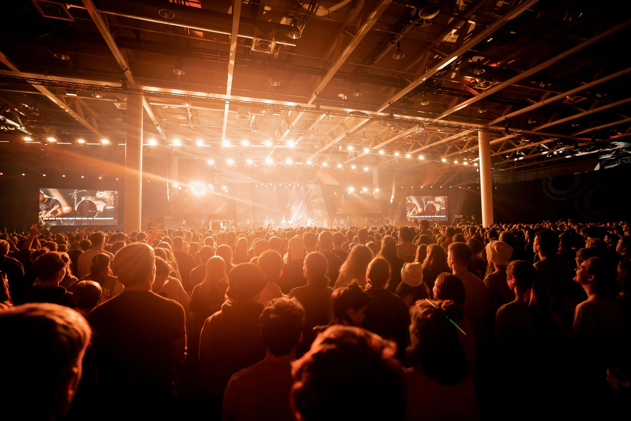 Menschen bei einem Konzert oder einer Veranstaltung in einem großen, offenen Raum mit Lichtern und Bildschirmen im Hintergrund.