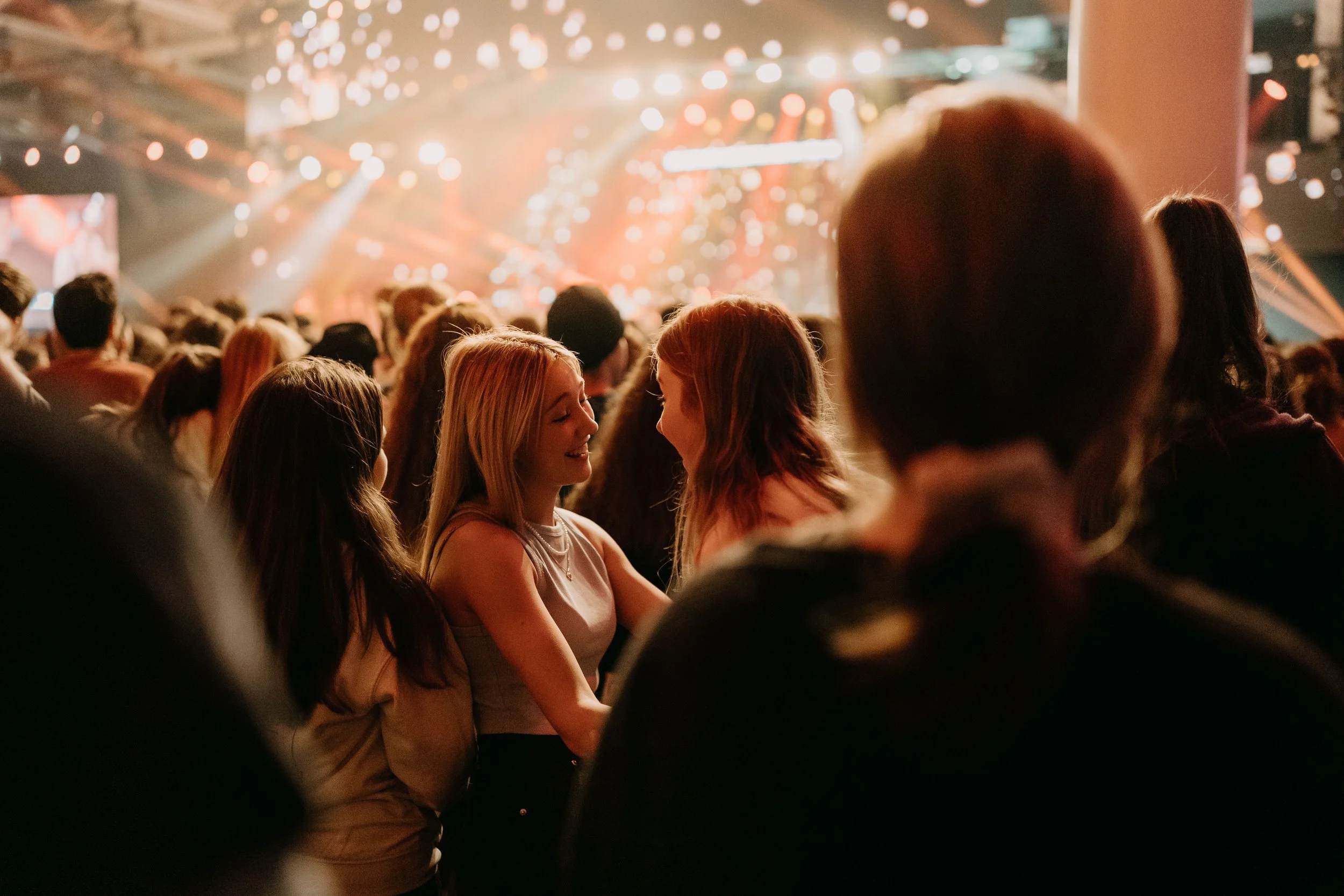 Menschen bei einem Konzert oder einer Veranstaltung, im Vordergrund zwei lachende Frauen, im Hintergrund viele weitere Personen, Bühne mit Lichtern, festliche Atmosphäre.