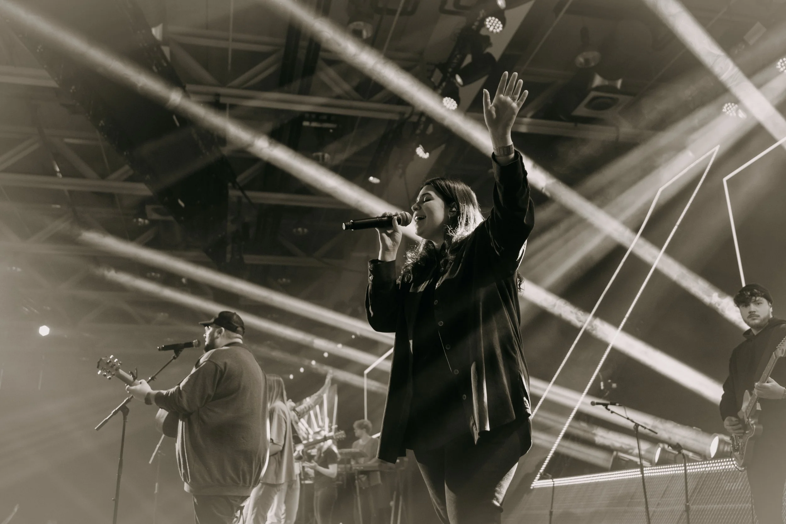 Eine Live-Musikband auf der Bühne, die Sängerin singt und hebt eine Hand in die Luft, im Hintergrund spielen Bandmitglieder mit Instrumenten, Beleuchtungseffekte und ein Gare-Setup.