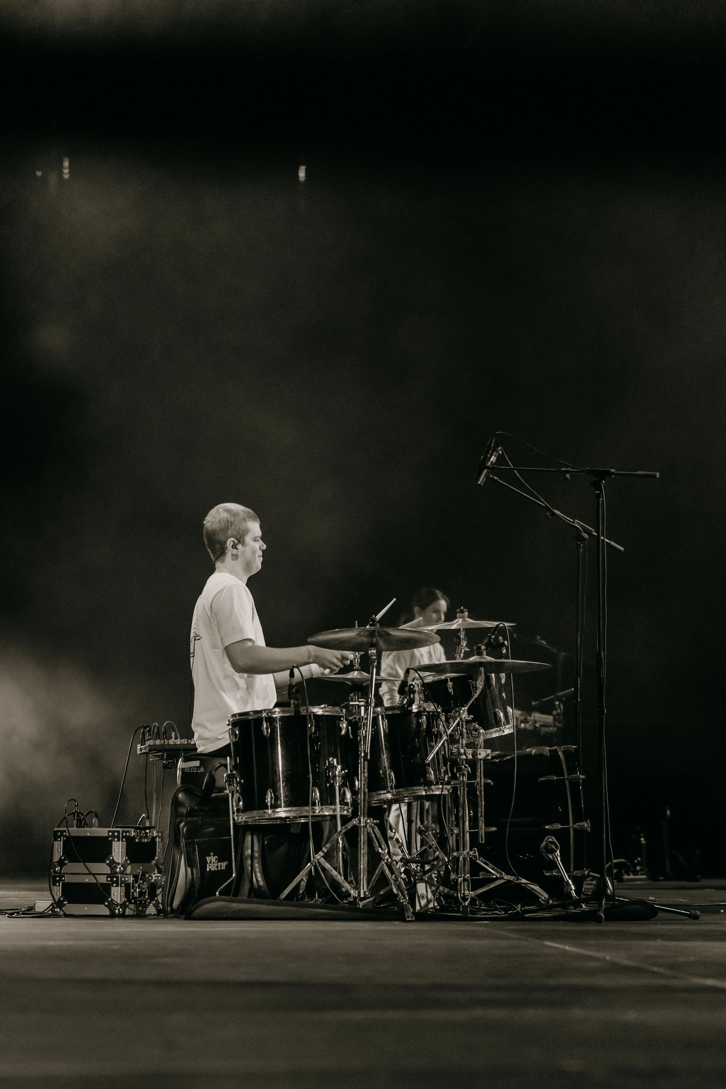 Zwei Musiker spielen Schlagzeug auf einer Bühne bei einem Auftritt, schwarz-weiße Aufnahme.