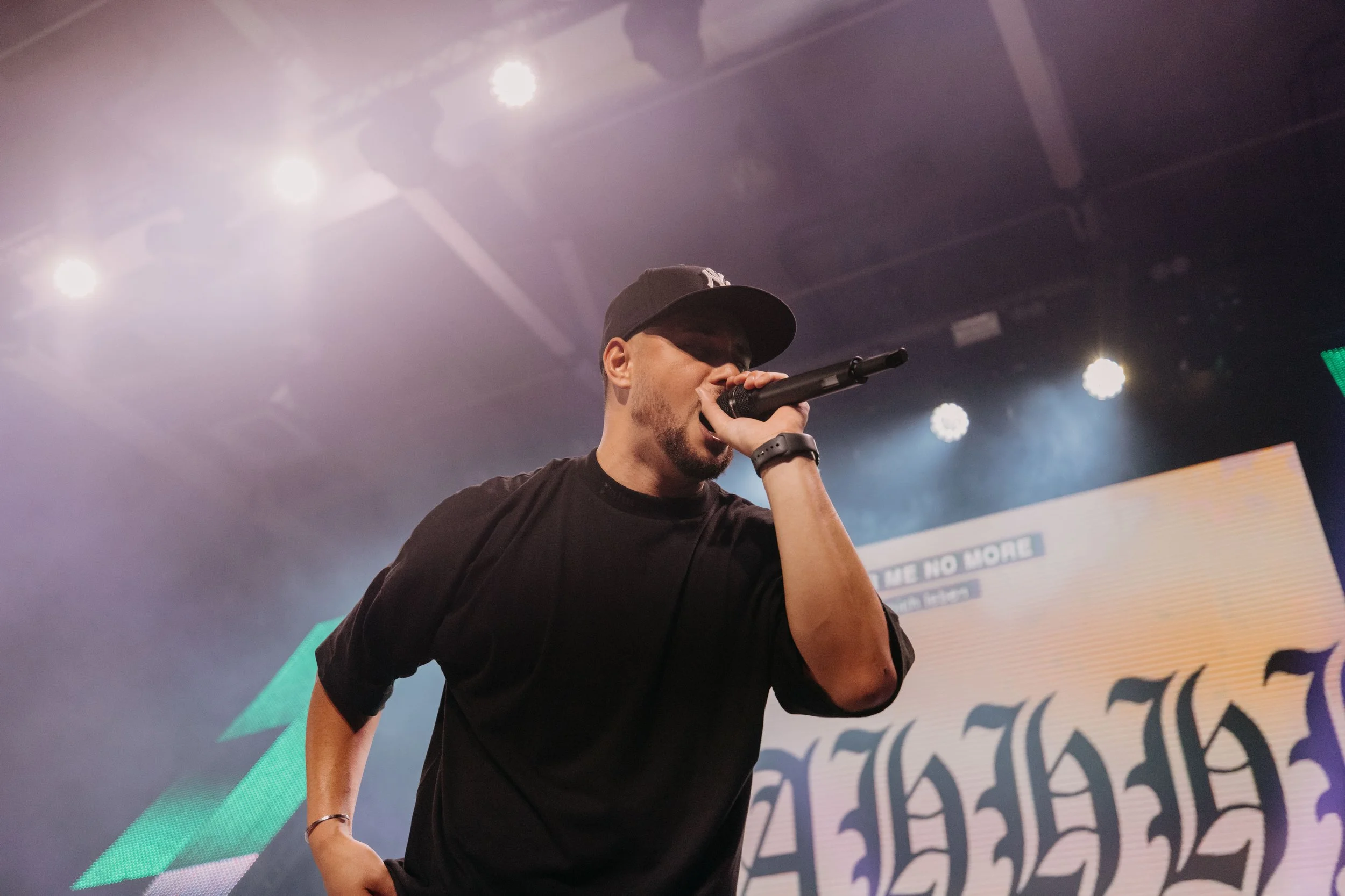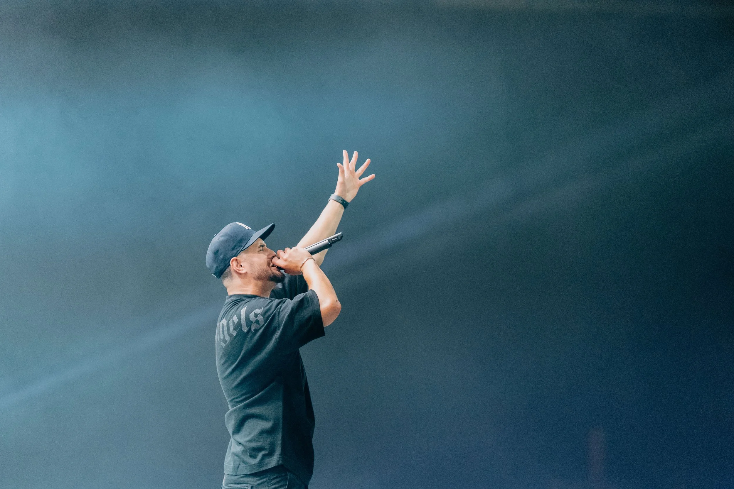 Ein männlicher Rapper trägt ein schwarzes T-Shirt, eine schwarze Kappe und einen schwarzen Armreif, hält ein Mikrofon und singt auf einer Bühne mit dunkel-blauem Hintergrund.