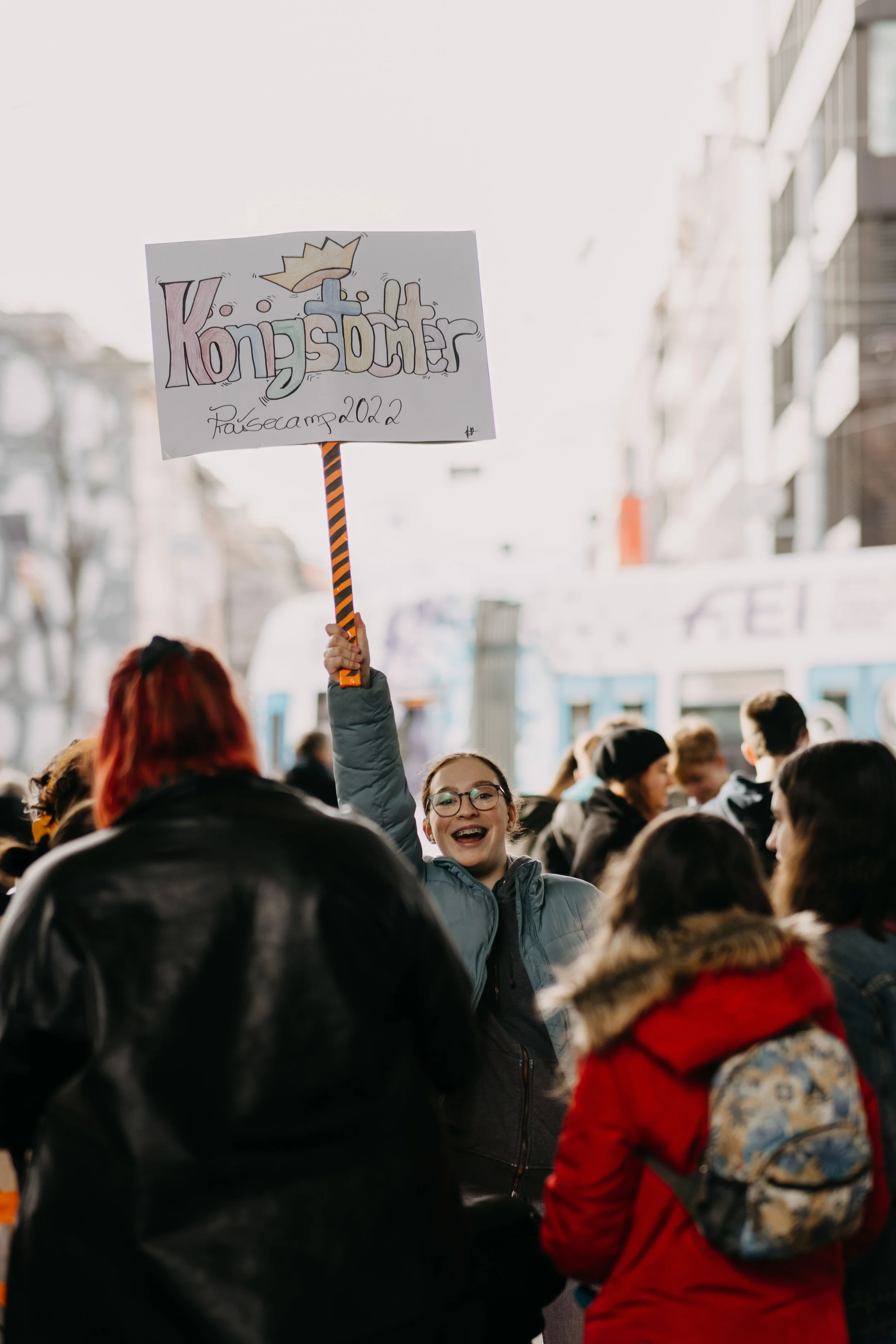 Eine lachende junge Frau hält ein Schild mit der Aufschrift "Komm raus" hoch, umgeben von einer Gruppe von Menschen bei einer Demonstration oder Versammlung auf einer Stadtstraße.