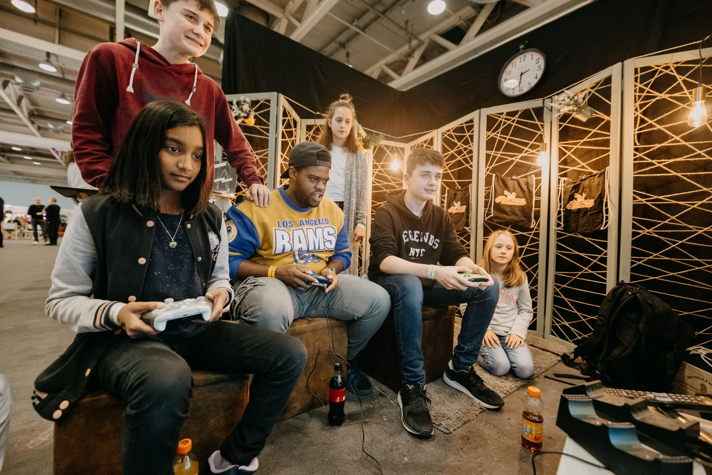 Sechs Jugendliche mit Game-Controllern, die zusammen Videospiele spielen, in einer Indoor-Veranstaltungsstätte.