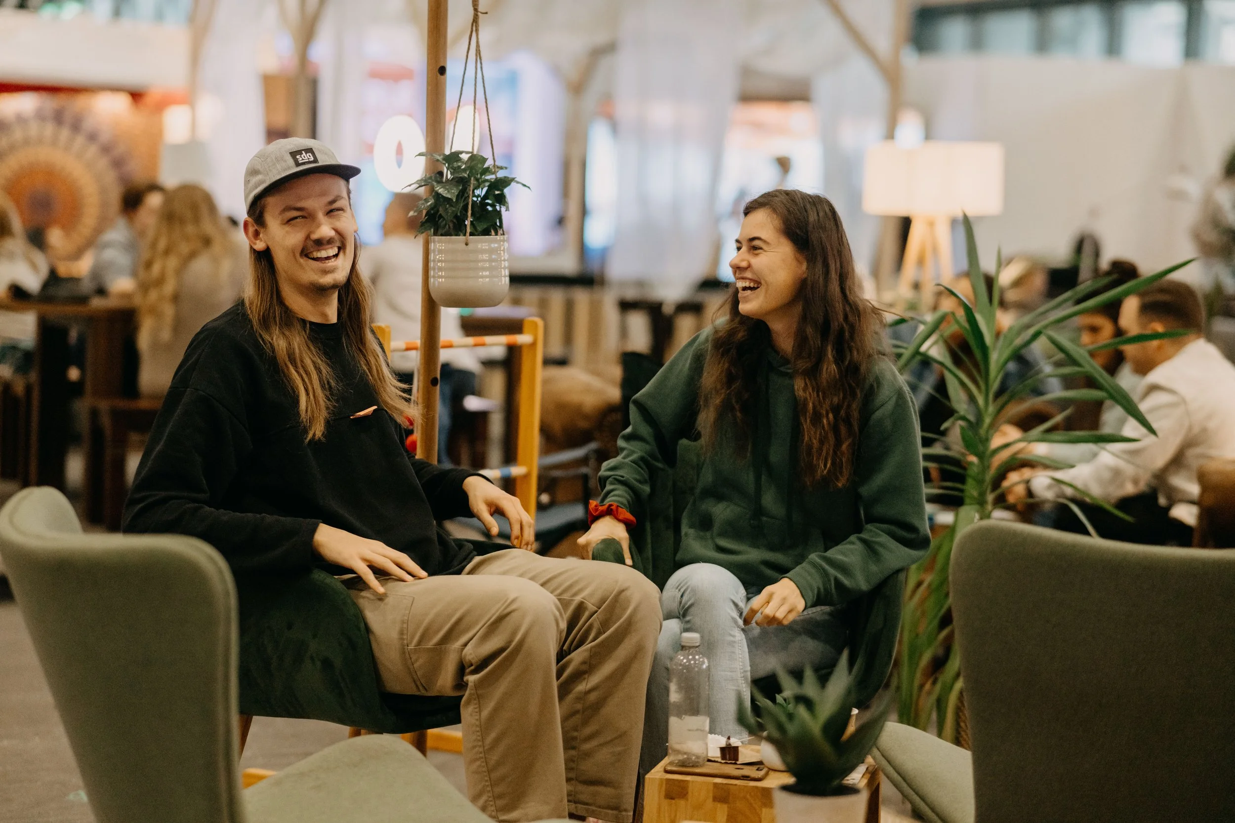 Zwei lachende junge Frauen sitzen in einem geselligen Umfeld, umgeben von Pflanzen und gemütlicher Einrichtung.