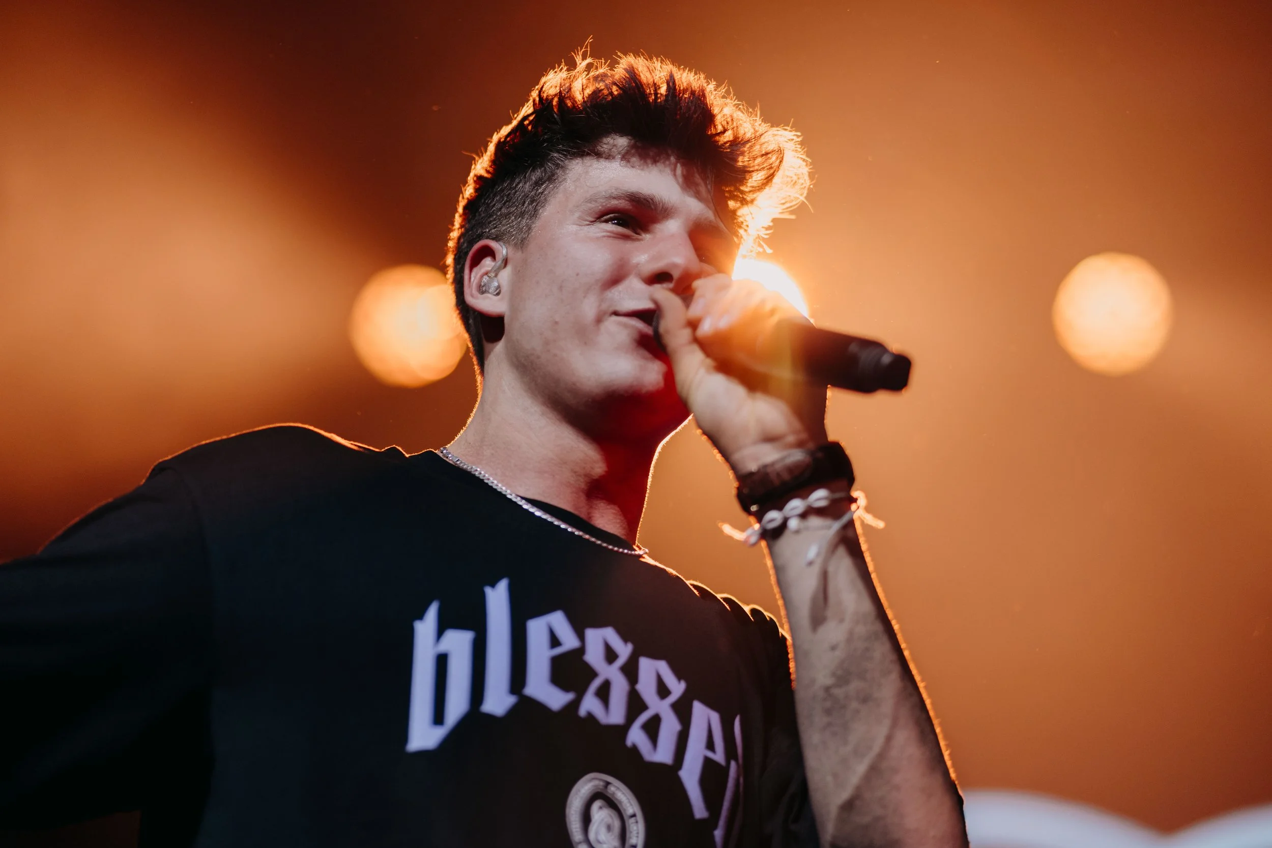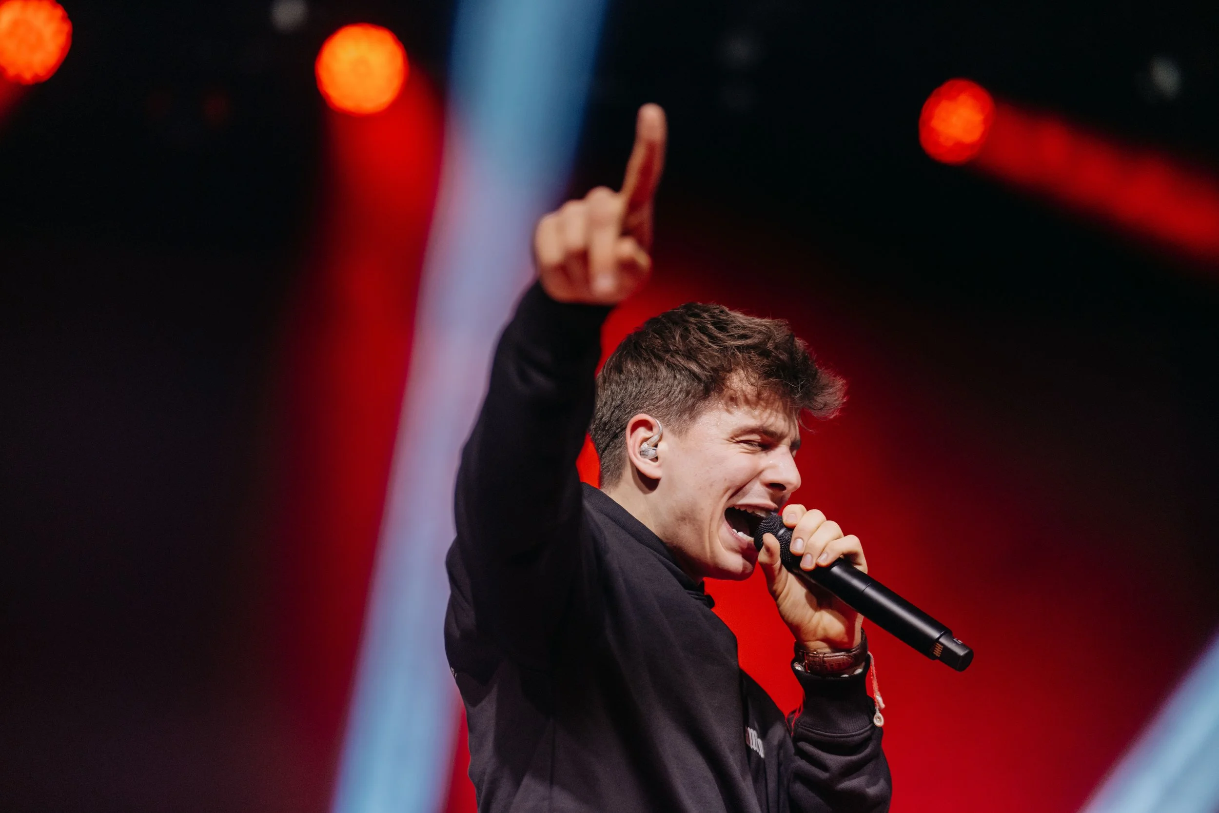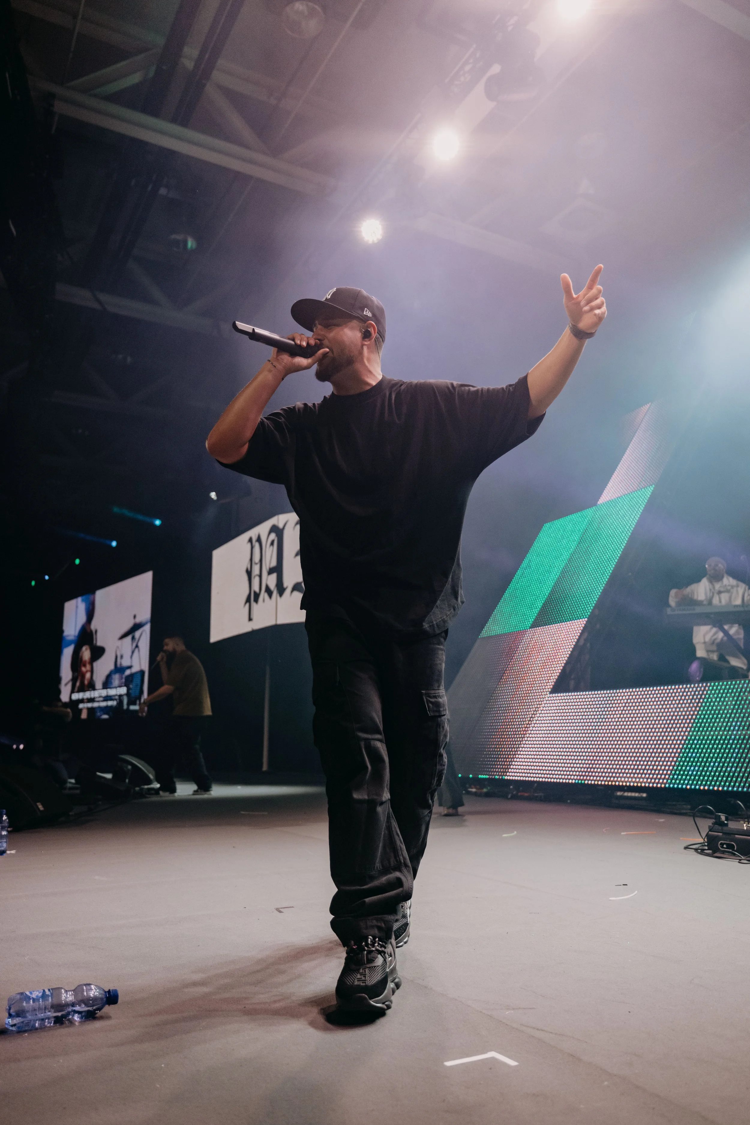 Ein junger Mann trägt eine schwarze Kappe und ein schwarzes T-Shirt, singt in ein Mikrofon bei einem Konzert auf einer Bühne mit bunten Lichtern und einer digitalem Hintergrund.