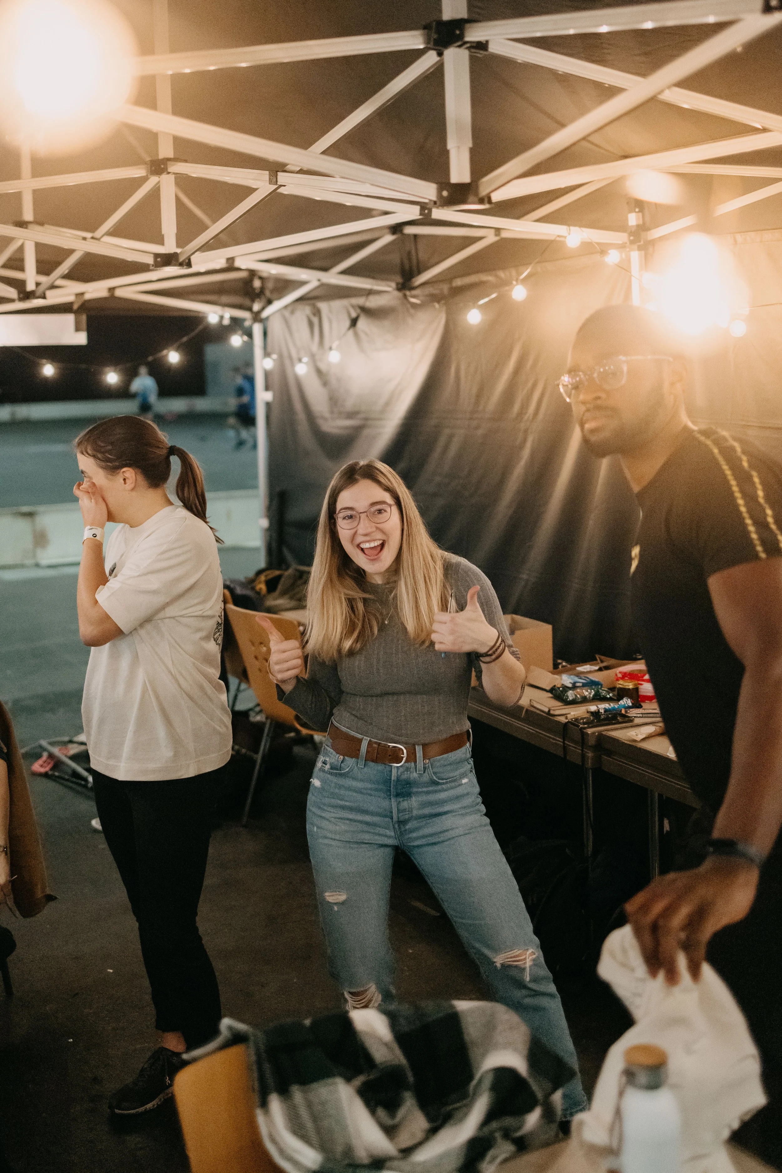 Lächelnde junge Frau mit Brille, die Daumen hoch zeigt, neben einer anderen Person, während sie unter einem Zelt bei einer abendlichen Veranstaltung steht.