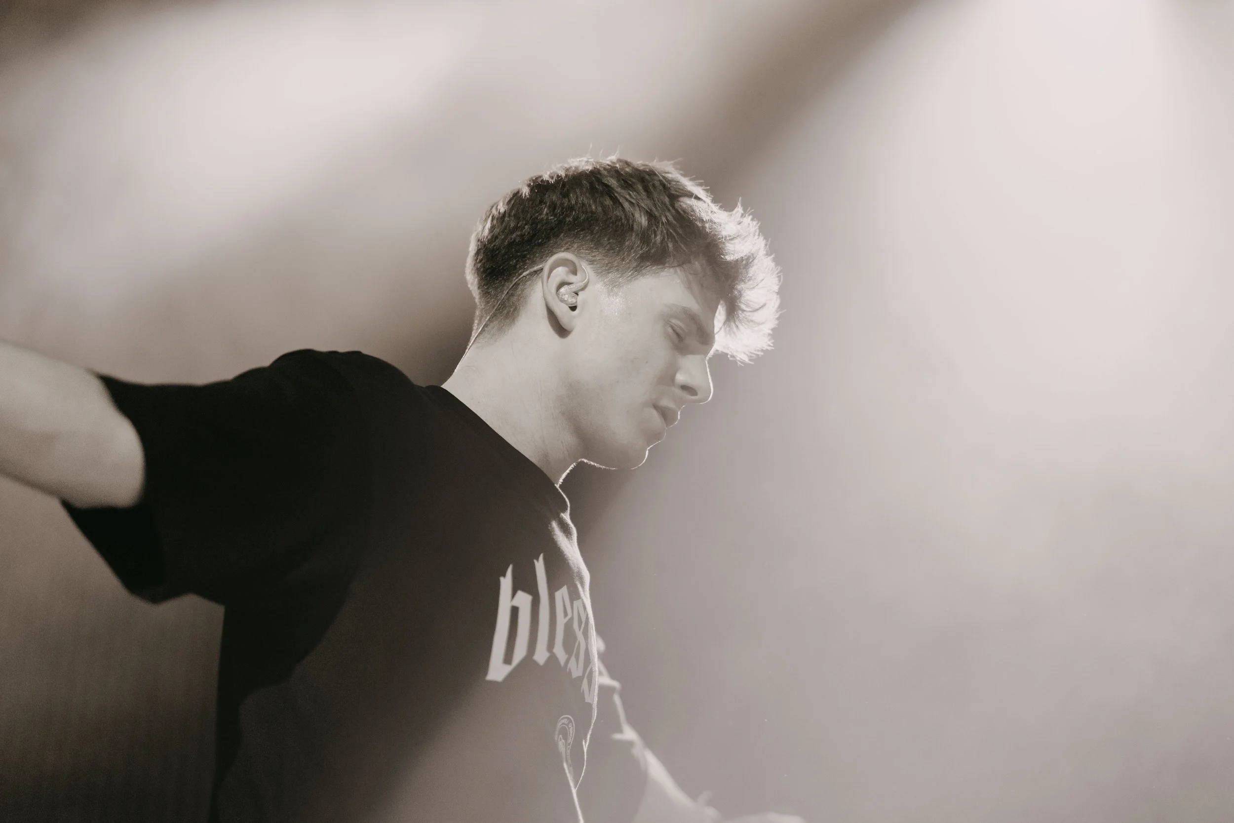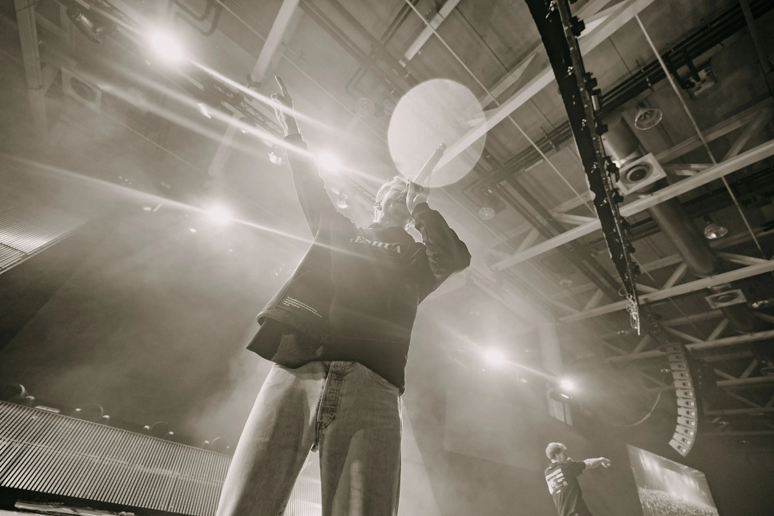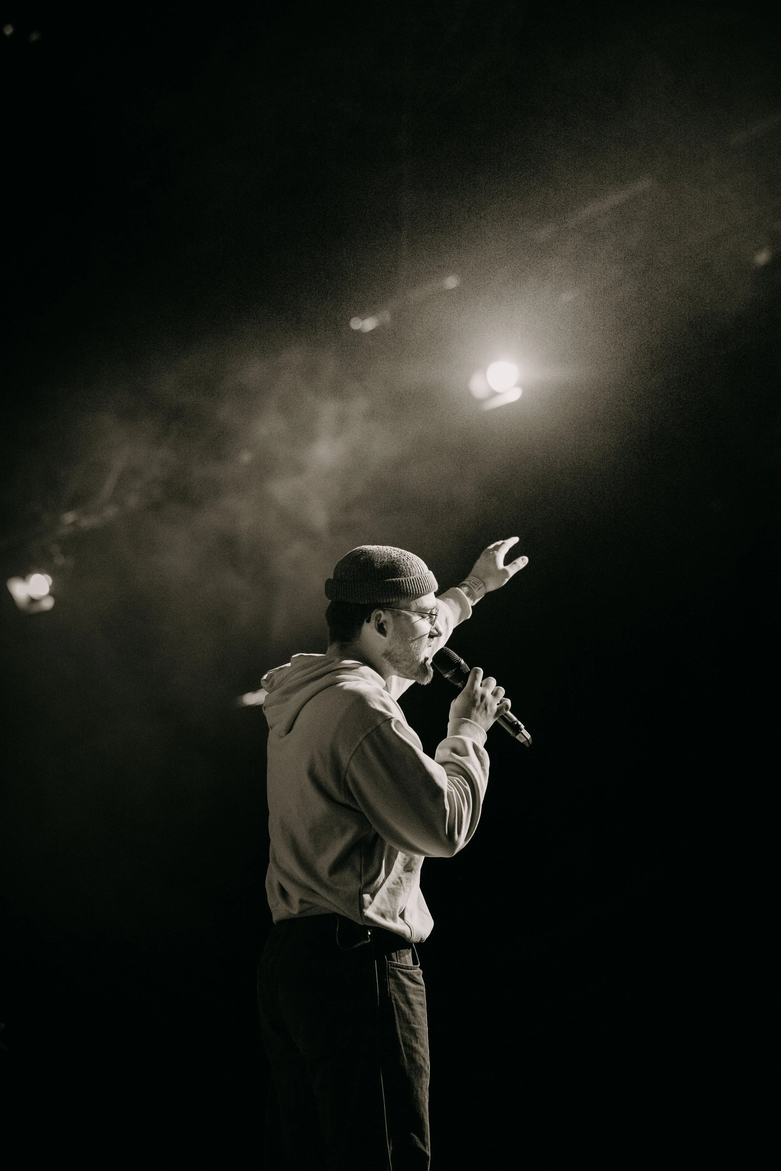 Ein junger Mann singt oder spricht in ein Mikrofon auf einer Bühne, umgeben von Scheinwerfern und einem Industrie-ähnlichen Deckenhintergrund, in Schwarz-Weiß.