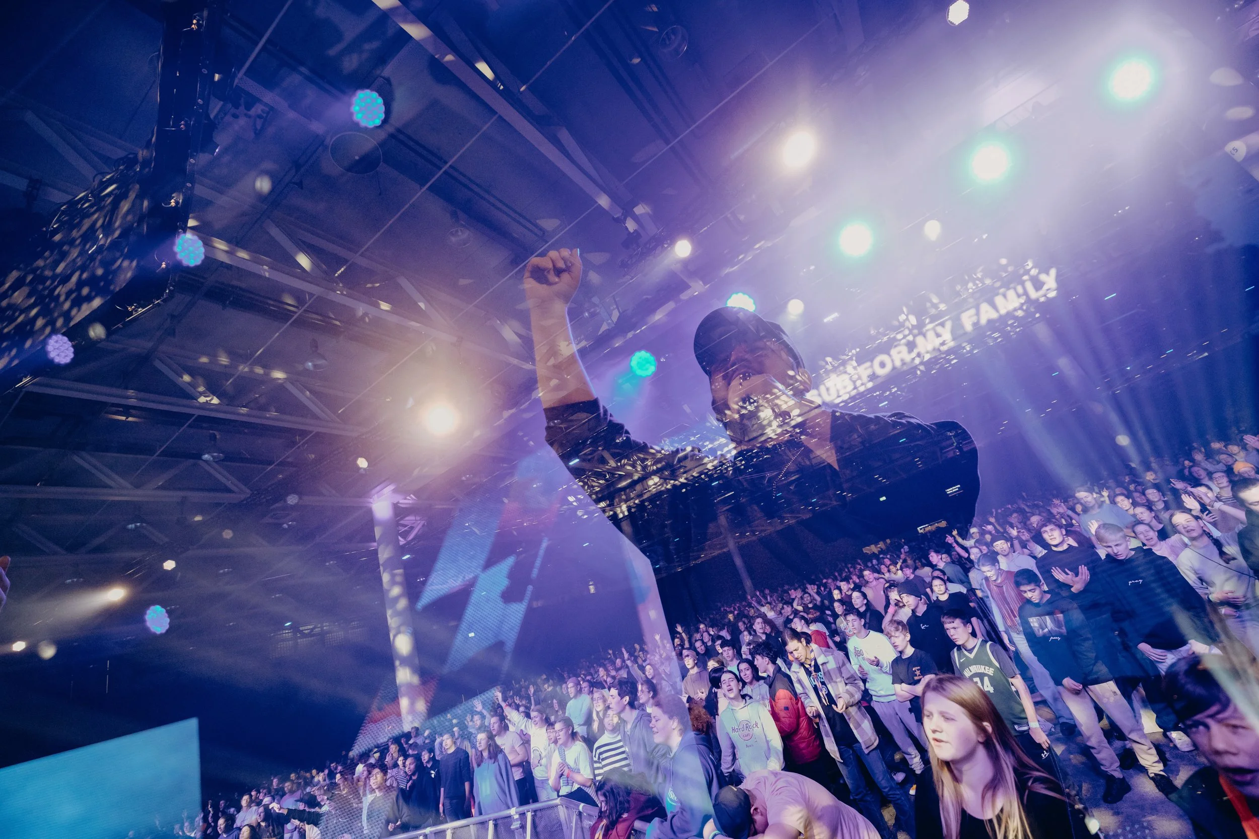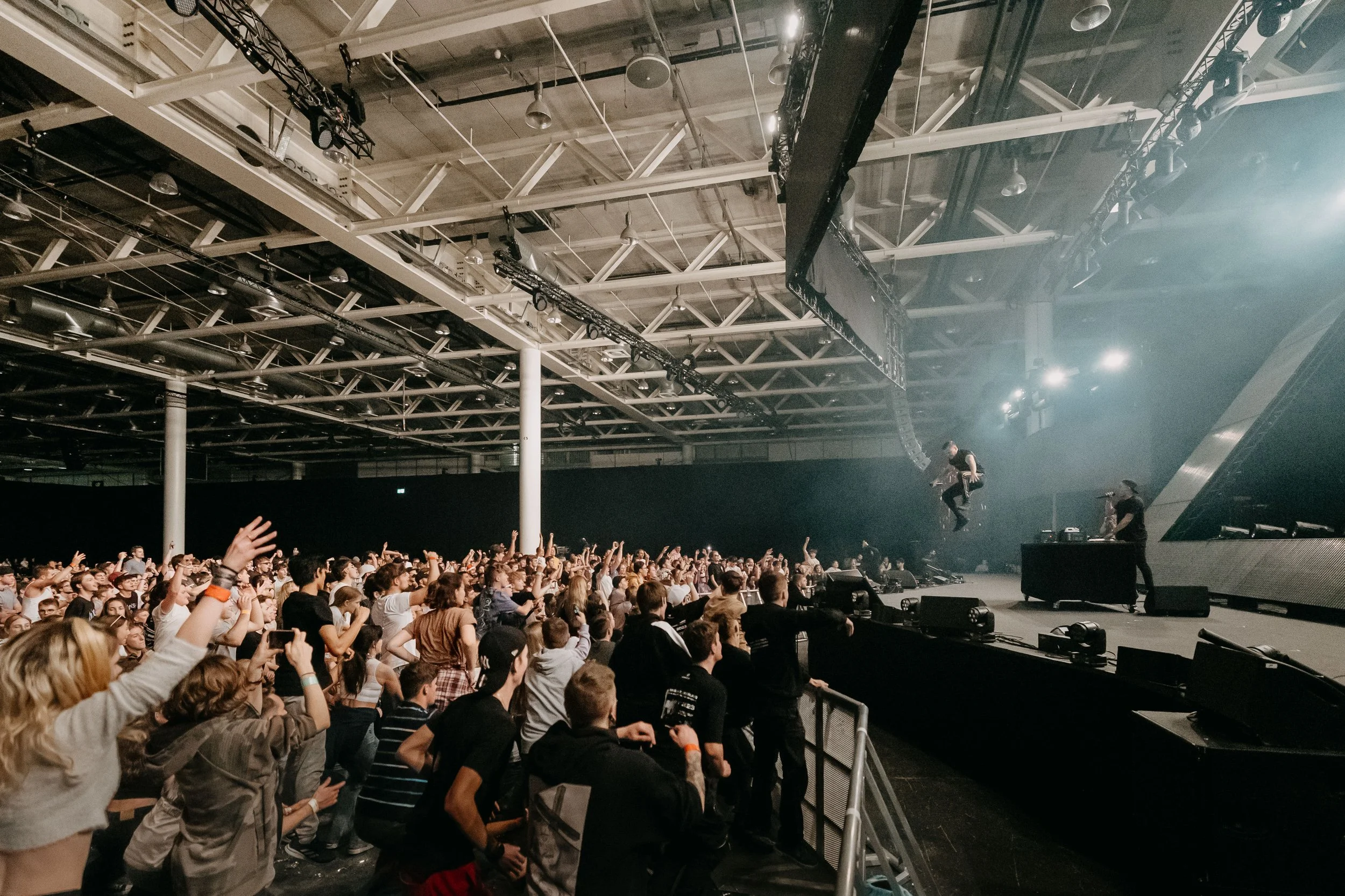 Eine Menschenmenge bei einem Konzert oder Musikfestival in einer großen Halle, mit zwei Musikern auf der Bühne, eine Person springt in die Luft.