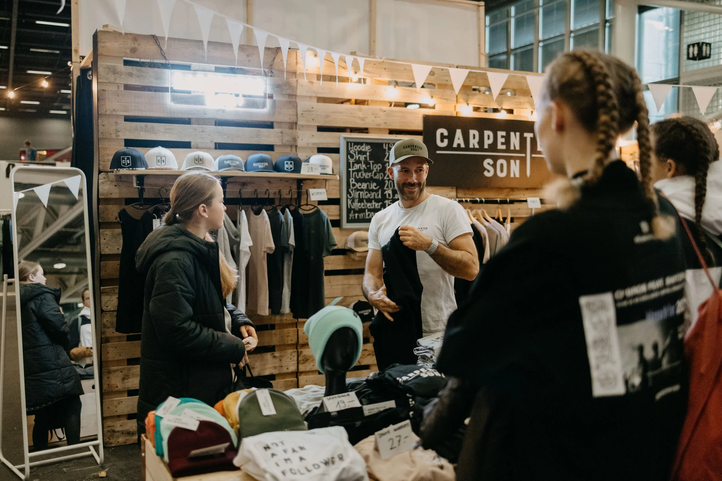 Menschen kaufen Kleidung auf einem Marktstand mit Holzdekoration und einer schwarzen Tafel, die Preise und Produkte auflisten, darunter Hüte, T-Shirts und Pullover.