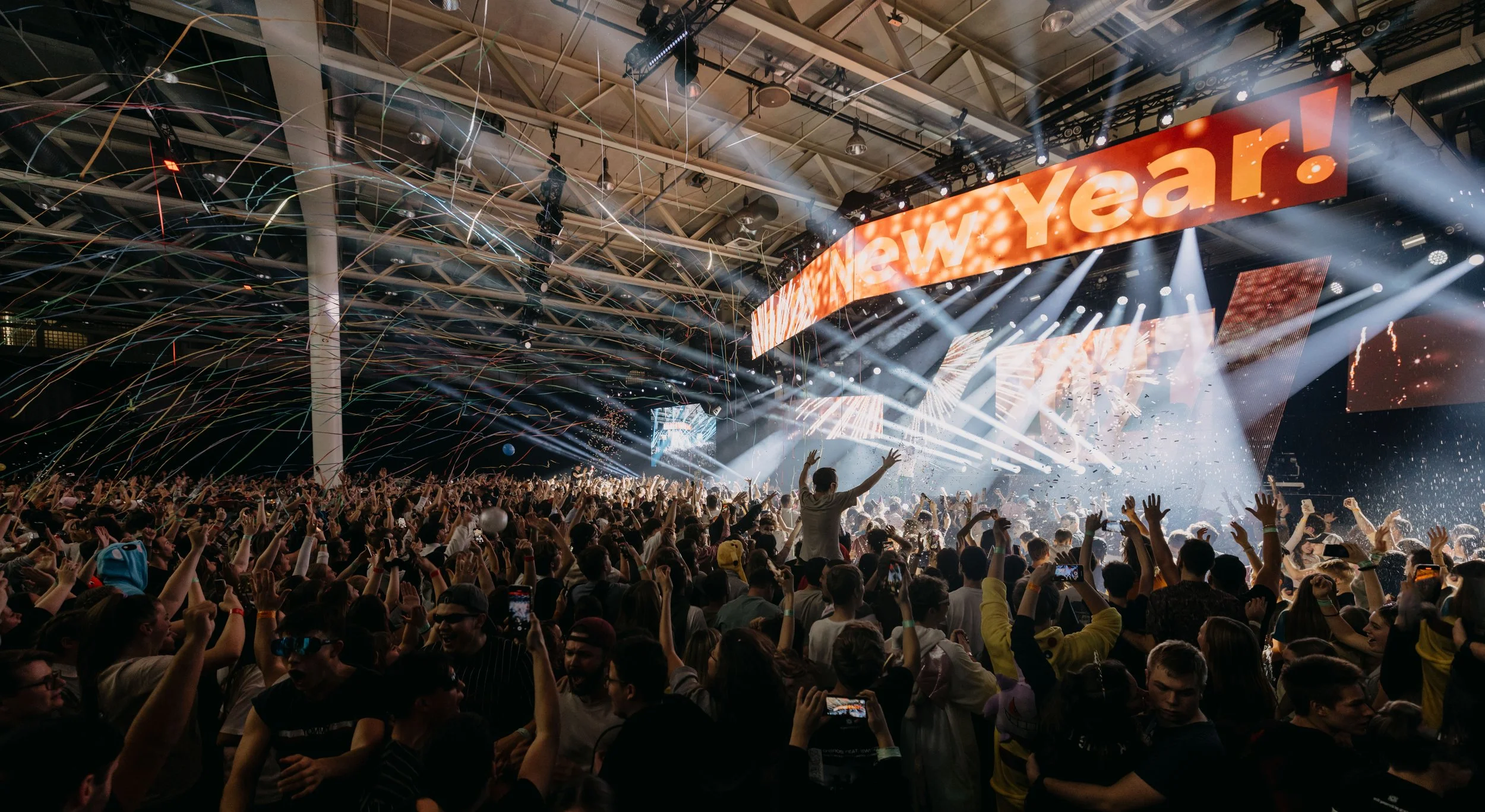 Menschen feiern bei einer großen Veranstaltung in einer Halle mit bunten Lichtern, Feuerwerk und einem großen Bildschirm mit der Aufschrift 'New Year!'